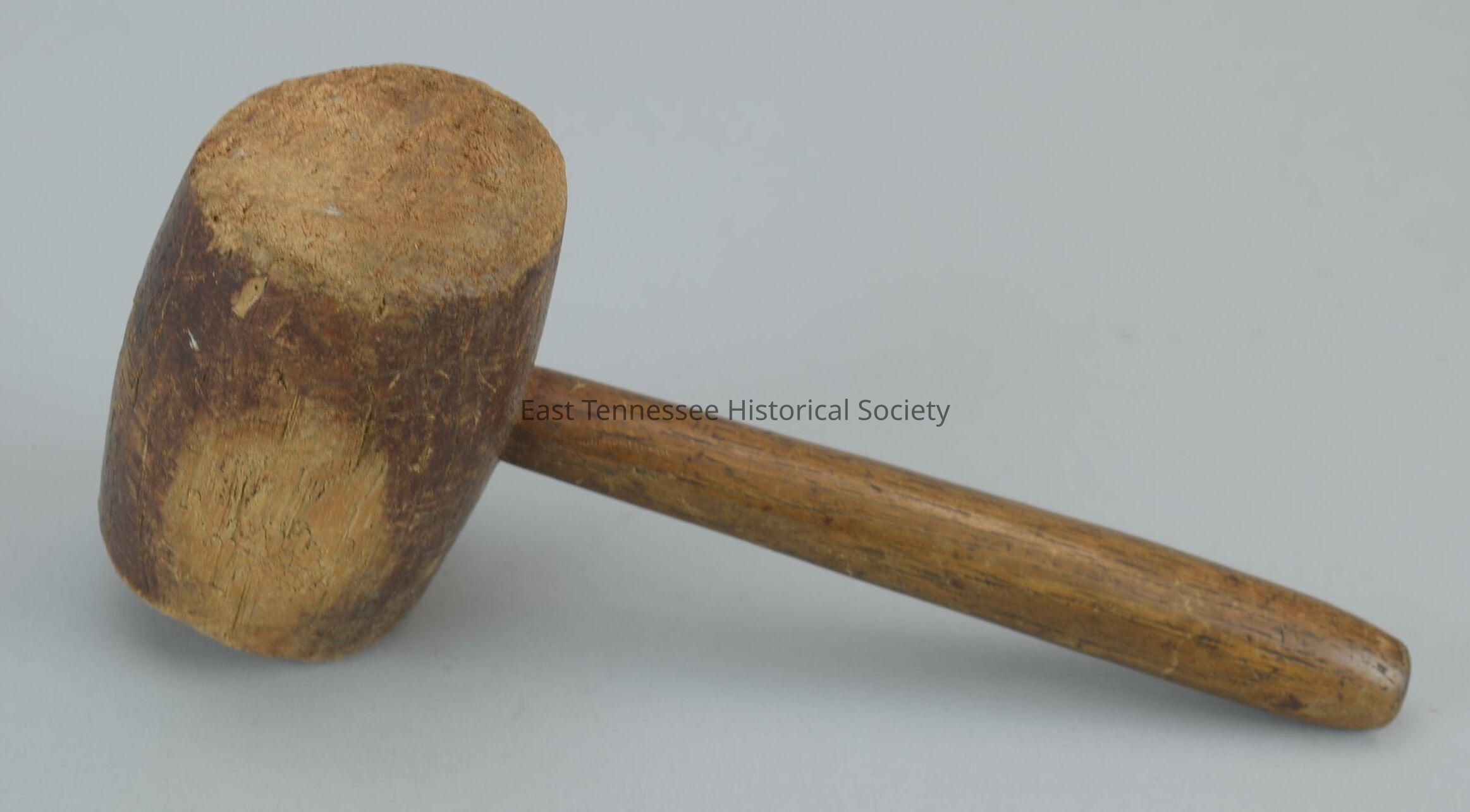 Mallet, varnished wood, tapered hickory or oak handle fitted through head, set of three lines carved around middle of head, manufacturer unknown, 10 1/4"h x 4 1/2"w x 2 3/4"d, date unknown.