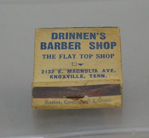 Matchbook, small paperboard folder imprinted with blue lettering on white background, front cover marked "DRINNEN'S / BARBER SHOP / The Flat Top Shop* / 2132 E. MAGNOLIA AVE. / KNOXVILLE, TENN," coarse narrow black striking surface at bottom front edge, back cover shows two scenes of barbers working at top left and bottom right wtth "BARBER SHOP" on diagonal between, "Quick Service" and "Sanitary" in script at top right and bottom left, matches on interior attached in comb-like arrangement, 2"h x 1 1/2"w x 3/8"d,1950-1965. Match tips have been removed.