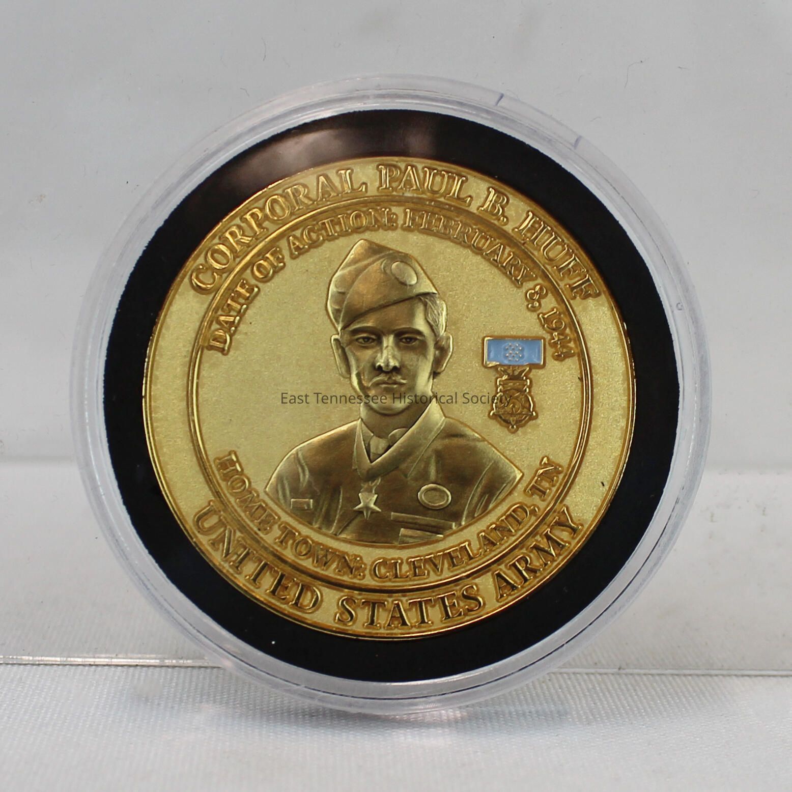 Medal of Honor challenge coin/medallion issued by the East Tennessee Veterans Memorial Association in commemoration of recipient Corporal Paul R. Huff U.S. Army, gold-color metal, image of Huff on obverse with soldier's name, date of action, hometown, and branch of service in band around perimeter, "East Tennessee Veterans Memorial Association" around center ETVMA logo/design of three stars in circle on reverse and ETVMA, Honor Our Fallen, sealed in circular clear plexiglass case, unknown manufacturer, 3/8"h x 2 1/4" diam., 2013.Made/Created