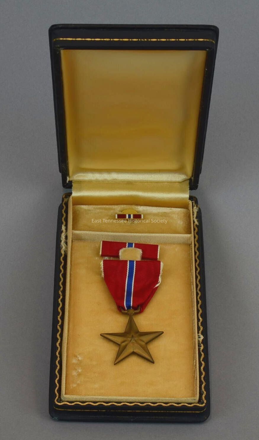 .1) Bronze Star medal awarded to Pat Gilley, bronze, 1 1/2" circumscribing diam., 3/16"diam. star superimposed star at center, rays of both stars come together at center line, "HEROIC OR MERITORIOUS ACHIEVEMENT" engraved on reverse, star suspended from ribbon by rectangular metal loop with rounded corners, 2 3/8"w ribbon of stripes--white/scarlet/white/untramarine blue/white/scarlet/white, awarded 12/22/1944 (per donor).
