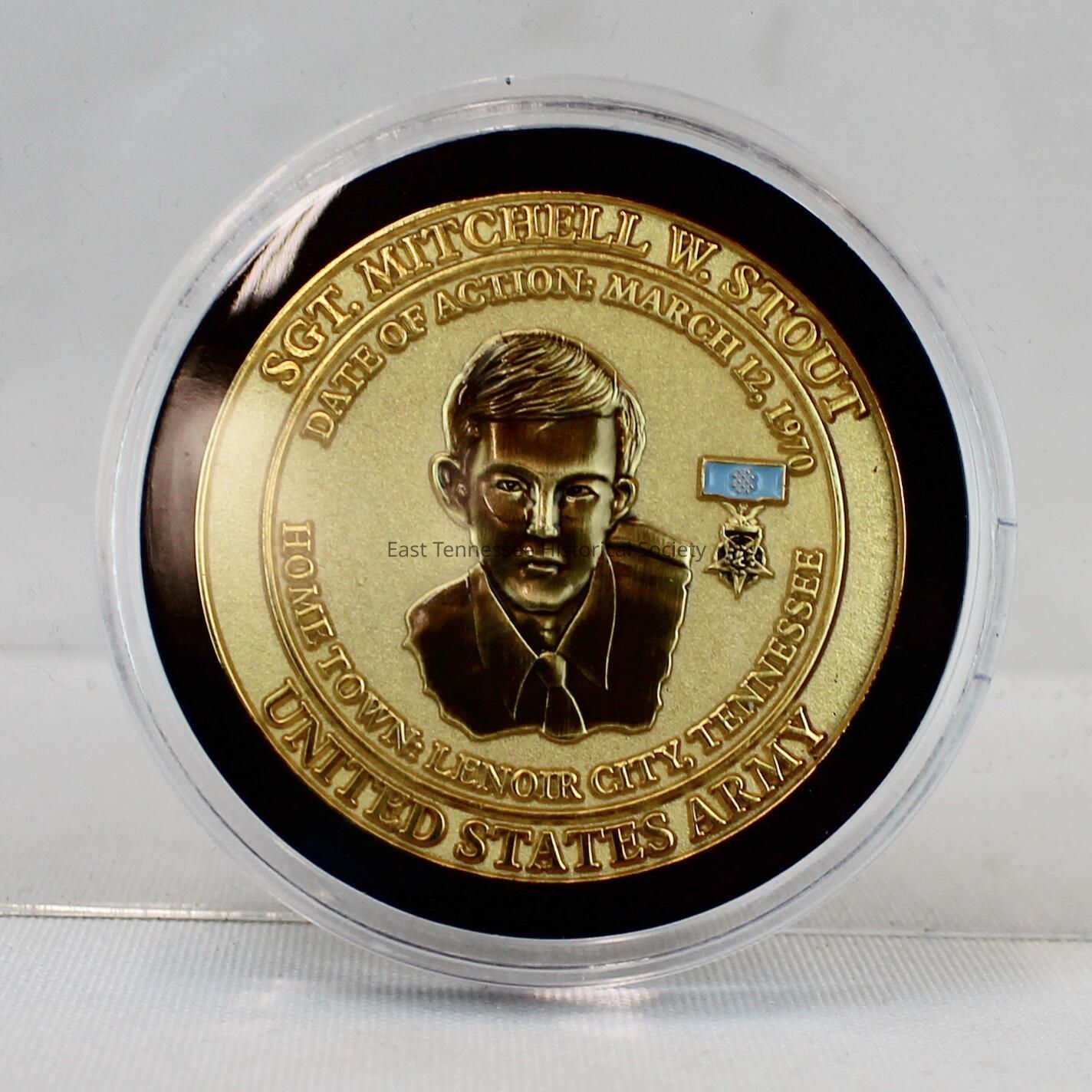 Medal of Honor challenge coin/medallion issued by the East Tennessee Veterans Memorial Association in commemoration of recipient Sgt. Mitchell W. Stout U.S. Army, gold-color metal, image of Stout on obverse with soldier's name, date of action, hometown, and branch of service in band around perimeter, "East Tennessee Veterans Memorial Association" around center ETVMA logo/design of three stars in circle on reverse with ETVMA, Honor Our Fallen sealed in circular plexiglass case, unknown manufacturer, 3/8"h x 2 1/4" diam., 2012.Made/Created