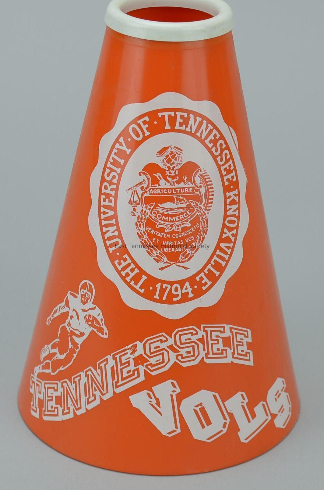 U.T. Vols megaphone of Sara Elder, orange and white plastic, bears ads for WNOX and The Knox, mid-1970s.