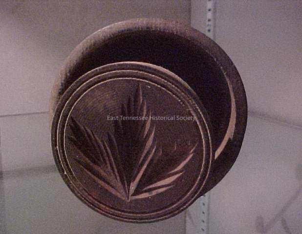 Two-part round butter mold from Murphy farm, wooden (stained or darkened with age), leaf design on stamp, 4 1/4"h x 5 1/2"w x 3 1/4"d (or sideways to show design--3 1/4"h x 5 1/2"w x 4 1/4"d).