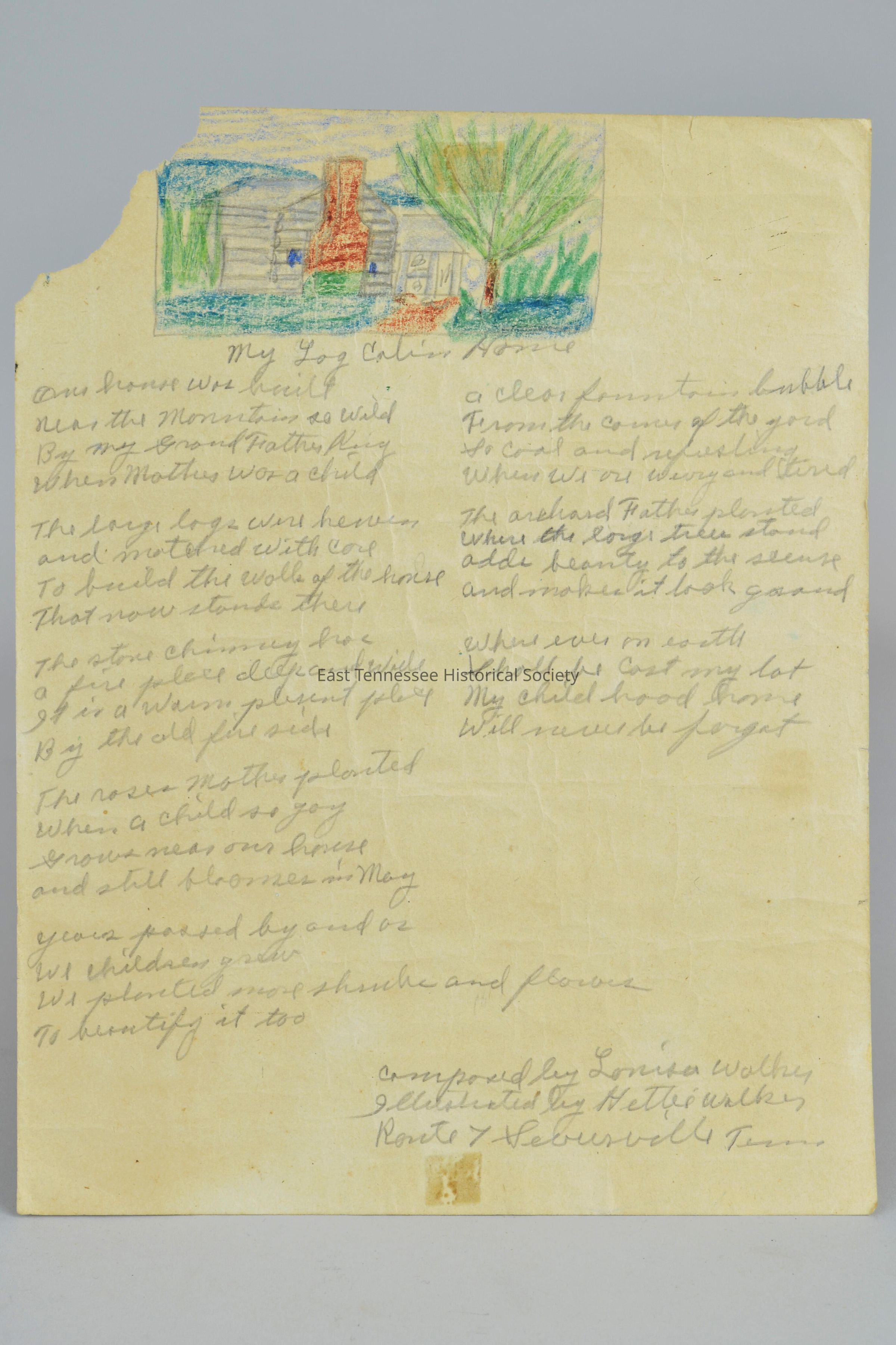 Poem written on 8 1/2" by 11" paper with no lines displaying an illustration at top of a log cabin that is centered at top but slightly to the left, title is directly underneath drawing "My Log Cabin Home", under title is the poem which is constructed in two columns, with eight paragraphs total, four lines in each paragraph, at the bottom right the maker wrote, "Composed by Louisa Walker/ Illustrated by Hettie Walker/ Route 7 Sevierville, Tenn."