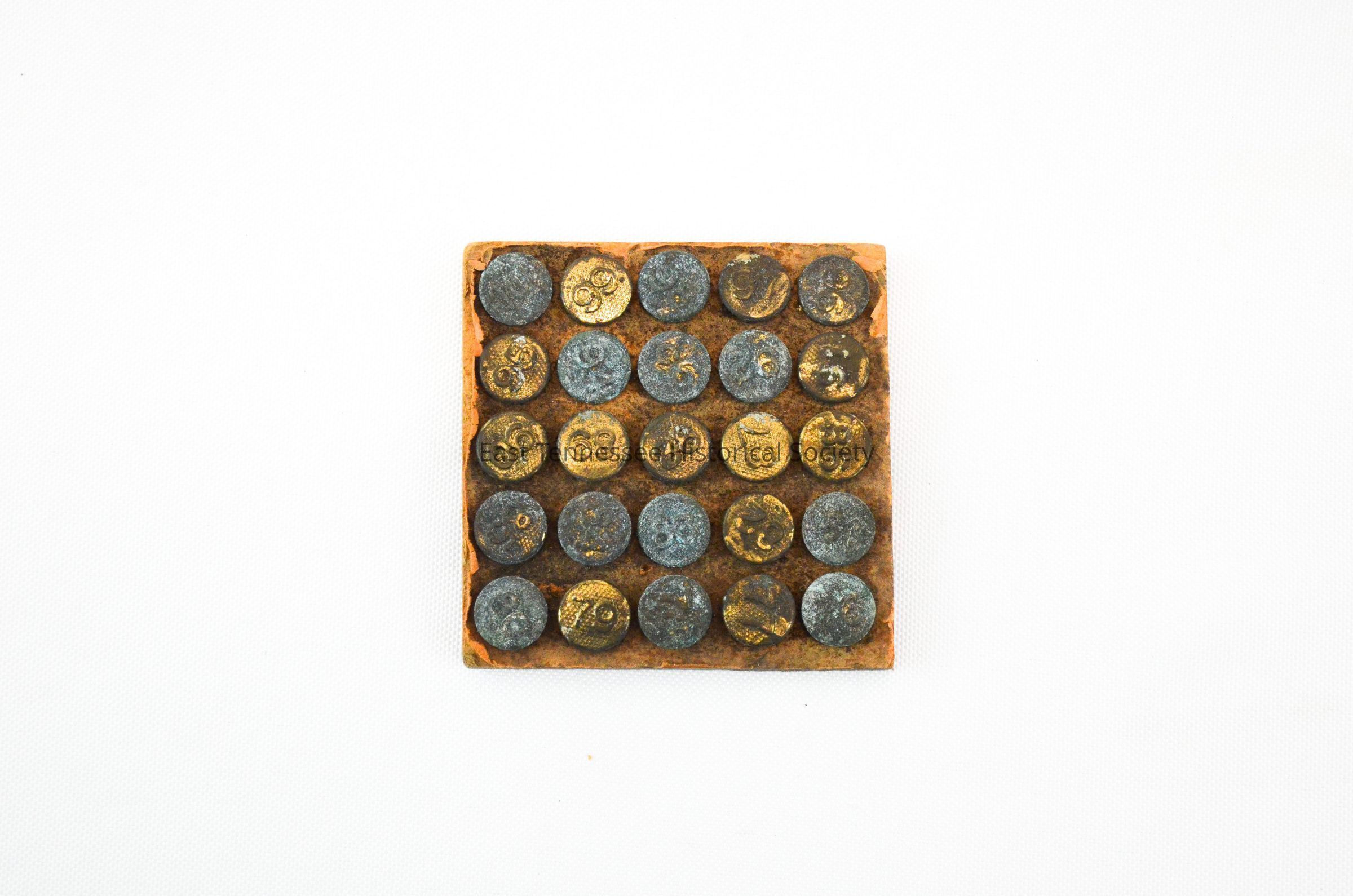 Set of 25 waypoint markers used during surveying, metal, short sharp-pointed nail/tack having a broad head with embossed two/three-digit number (from 76-100), would have fastened into pole/tree or the like to mark a specific location, manufacturer unknown, c. 1933?Made/Created