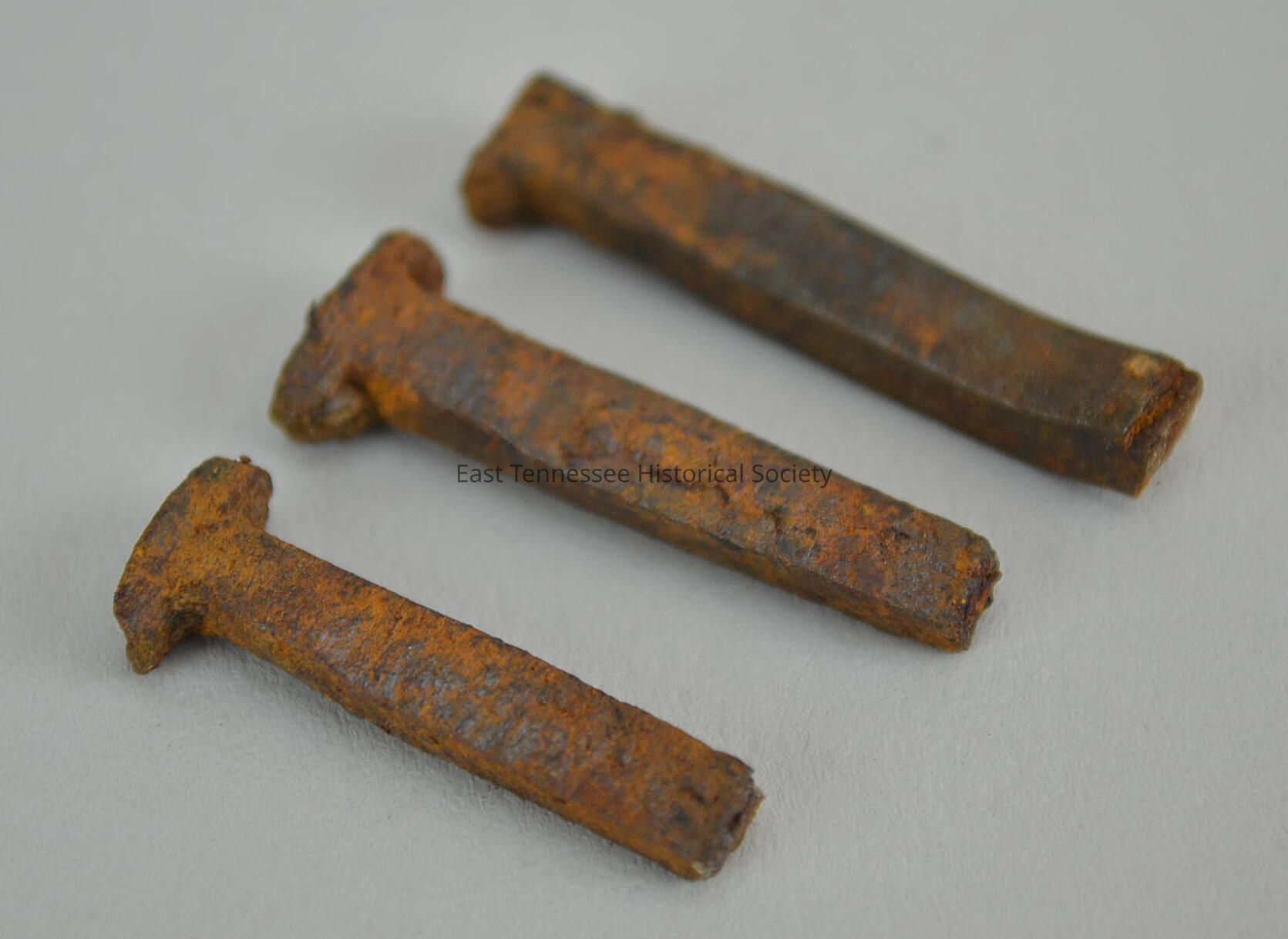 Nails (three short) from the George Evans home, iron, hand-forged heads, variable length from 1/8"l-7/8"l, c. 1795.Made/Created