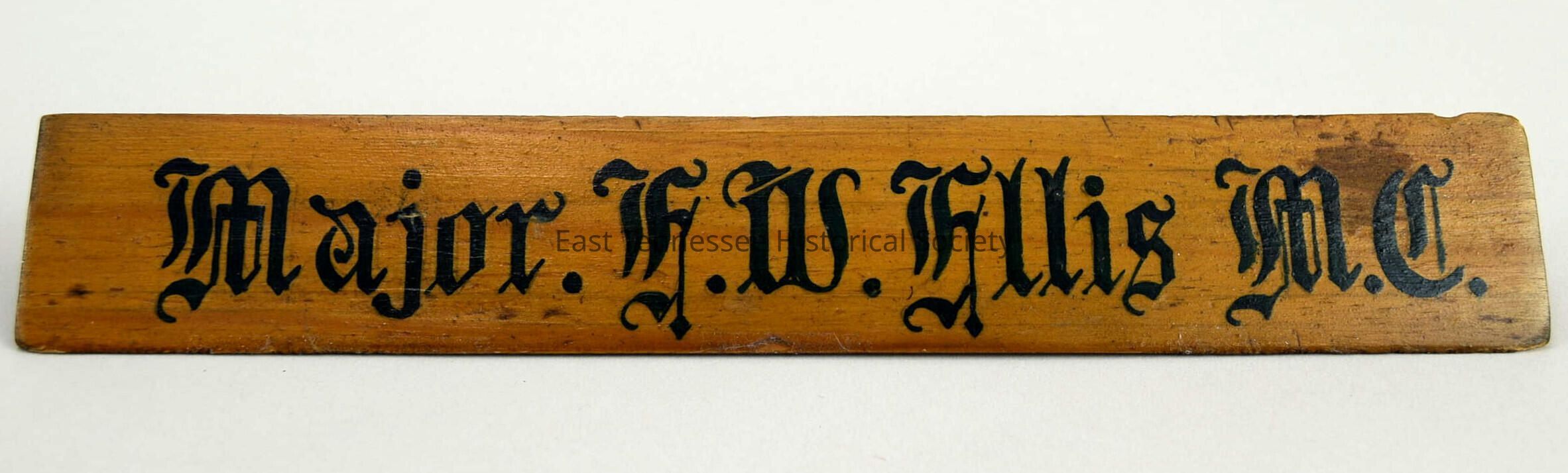 Desk nameplate, three-sided triangular brown wood, face reads "Major . E.W. Ellis M.C.[for Medical Corps]" in hand-painted black Old English-style script, without other markings, manufacturer unknown, 1 3/8"h x 1 1/4"w x 1 7/16, c. 1942.Made/Created