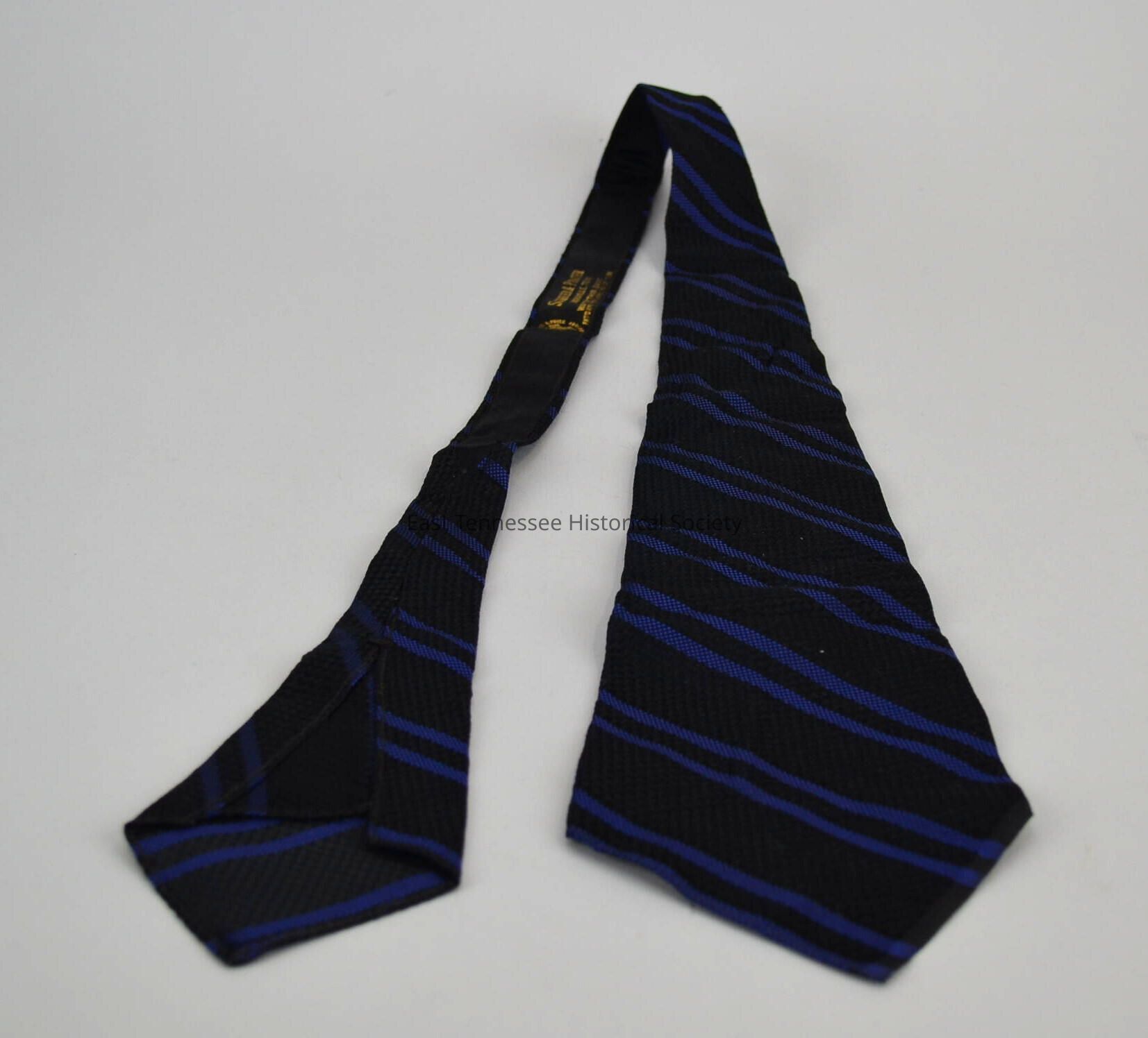 Man's tie, textured black silk with blue-purple (cobalt blue) diagonal stripes, black back neck band, stitched to tie, off-white bias-cut flannel lining, label marked "Blanchard & Price Fifth Ave. New York" and SCHRIVER & PRATER / KNOXVILLE, TENN. / WAFER THIN BAND / PAT'D APR.5.1910 JUNE 1.1909 OCT.7.1911," manufactured by Blanchard & Price (Fifth Ave., New York), 45 1/2"l x 4 1/2"w, c. 1913-1918.Made/Created