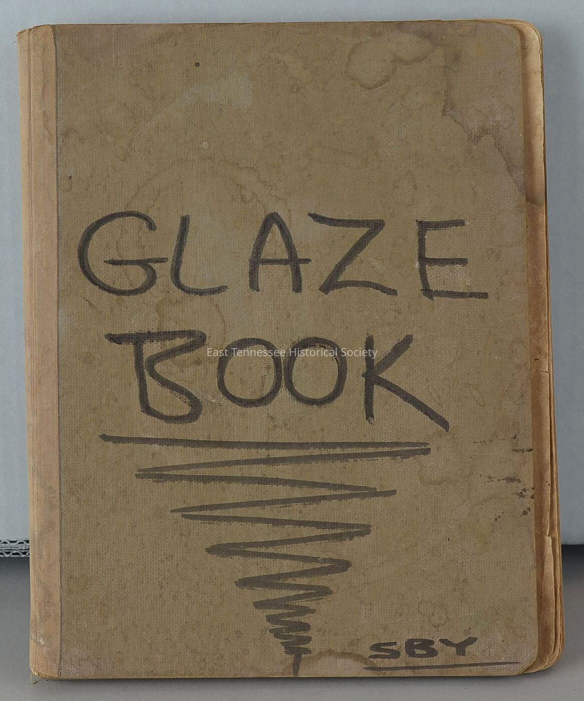 Notebook of Sara B. Young, plain brown cover marked "GLAZE / BOOK" in large black letters, "SBY" in bottom right corner, contains notes on glazing and patterns for pottery, 9 1/2"h x 7 5/8"w, date unknown.Dimensions