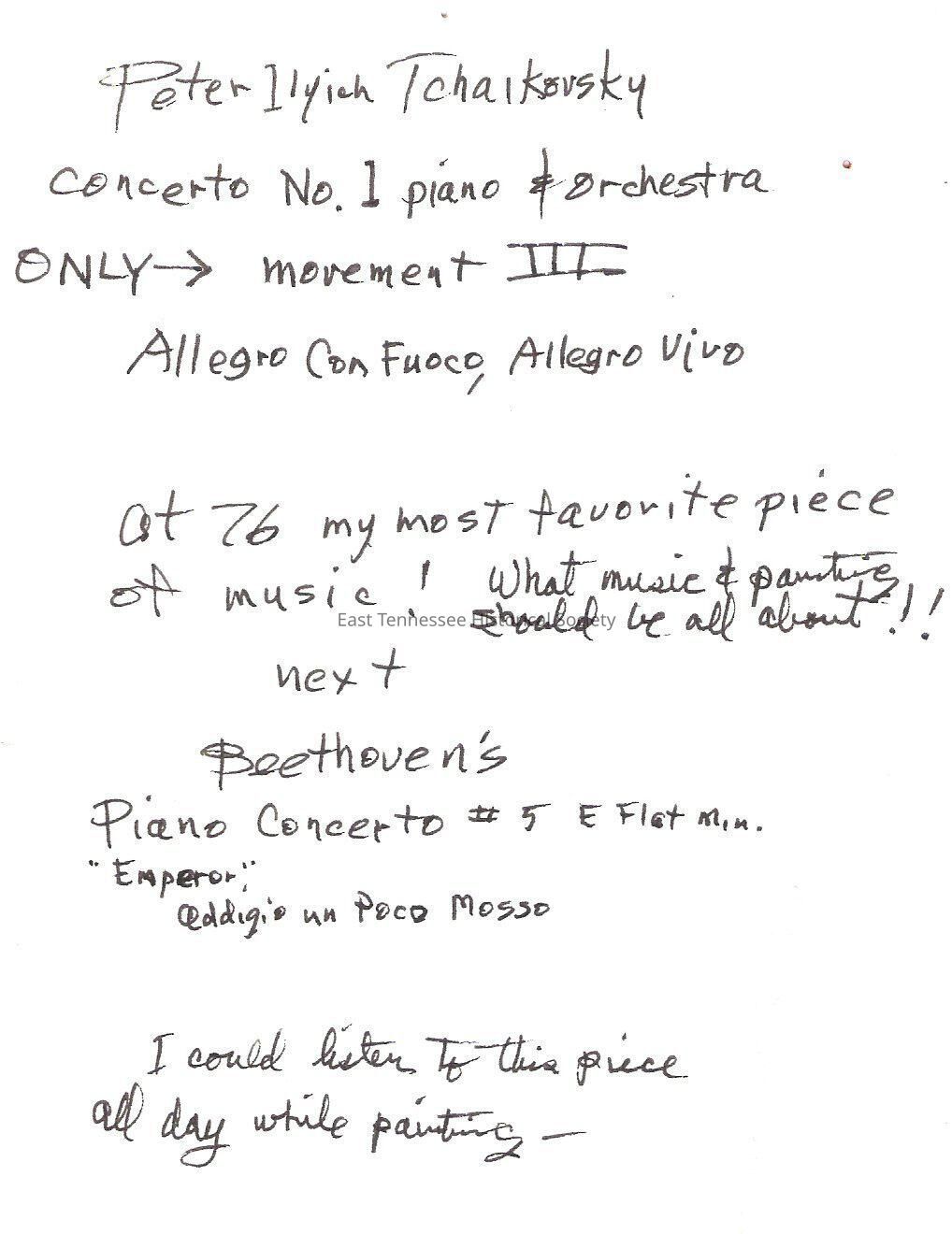 Play list (and comments) in Jim Gray's hand, off-white paper, 7 1/2"h x 5 1/2"w, date?