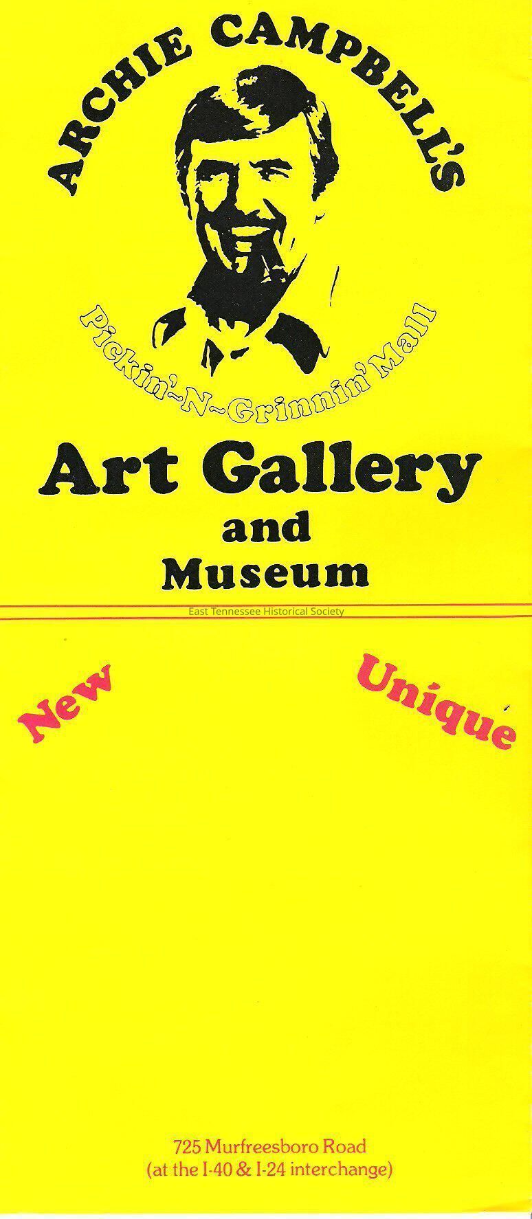 Brochure for "ARCHIE CAMPBELL'S / ART GALLERY / AND / MUSEUM" [in Pickin'-N-Grinnin' Mall, Murfreesboro Road, Nashville], yellow paper exterior, mall-related text inside, 9"h x 4"w, date unknown.Collection