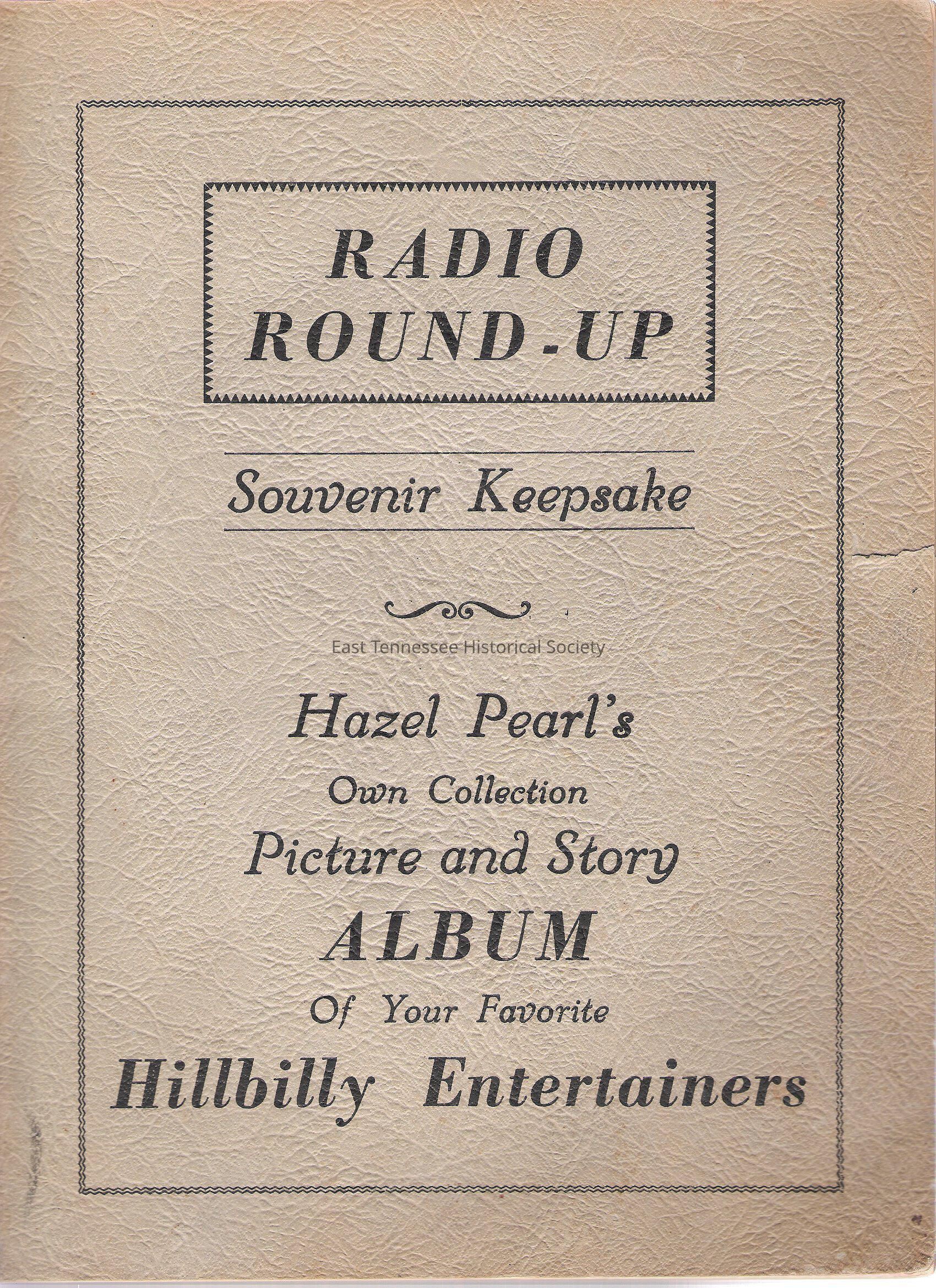 Booklet (souvenir keepsake), "Radio Round-Up: Hazel Pearl's Own Collection Picture and Story Album of Your Favorite Hillbilly Entertainers, " includes black-and-white photos of various entertainers (with pictures of Ralph Cornish, Hubert Messer, Judy Wilson, Smoky White, Archie Campbell, and Elizabeth Marcum) and short bios on many of them, 11 5/8"h x 8 3/4"w, c. 1948*.Collection
