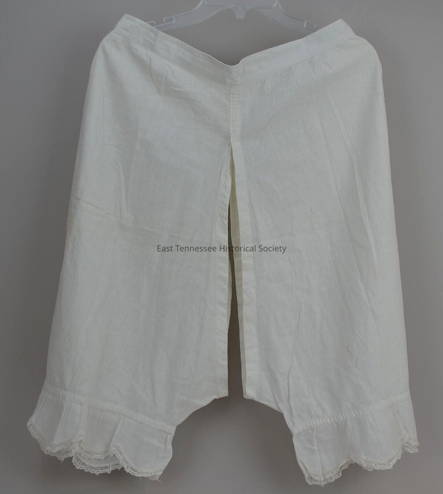 Woman's drawers/pantaloons of Mary Jane Larue French, white cotton muslin, lace edge ruffle around bottom of each leg, front open from 3" below waistband, button on back waistband with another 7 1/2" down, back completely open except for buttons, bottom 7" sewn together, handmade/assumed by Mary Ann Larue French, 26"h x 16"w, late 19th/early 20th century.Made/Created