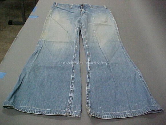 Pair of Levi blue jeans from Vawter family, bell bottoms, 39" x 16, 1960s?
