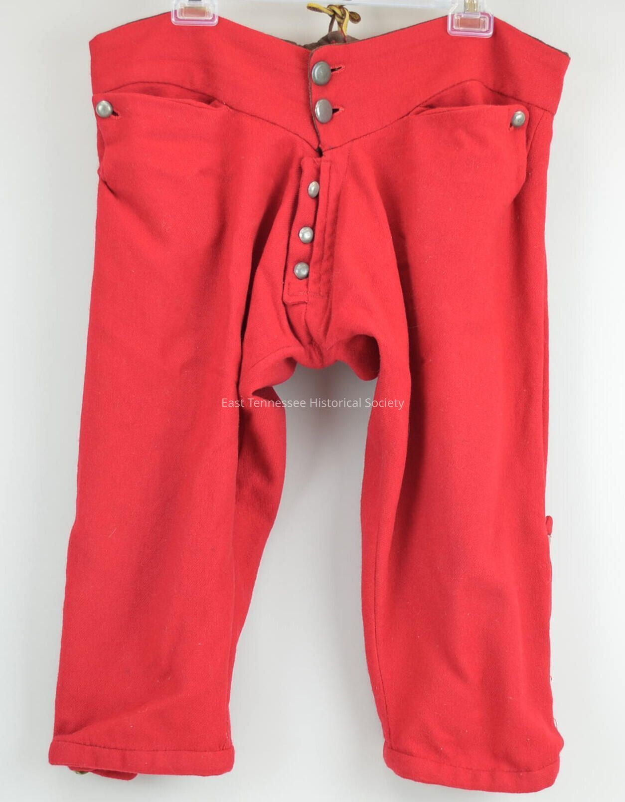 Reproduction French and Indian War-era officer's knee breeches used by reenactor Sam Reed, 100% scarlet dyed wool*, flat front with one button at corern, shaped waistband/wider at center front, three-button straight fly with two detachable strap buckles, lined with brown linen with two button closure, back waist adjustable with three hand-worked eyelets on each side of split waistband and secured with rawhide leather strip, self-fabric band around leg ends with brass buckle, five-button side flap, back blousy and gathered to waistband, pewter buttons, French seams/enclosed raw edges, made by Sam Reed (during the winter of 2006-2007), 2007.