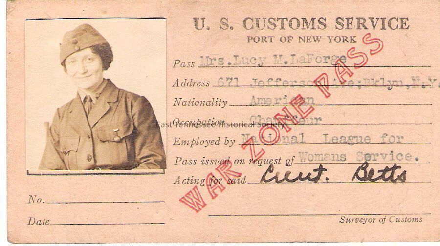 War-zone pass for Lucy LaForge, beige paper, head-shot photograph of woman [LaForge] affixed to top left corner, "U.S. CUSTOMS SERVICE / PORT OF NEW YORK" to right, LaForge's name/address/details of position typed below, "WAR ZONE PASS" printed diagonally across this information in open red letters, LaForge's signature on reverse with conditions of the pass printed below, includes square area for thumbprint [which is blank] U.S. Customs Service (Port of New York), 2 1/2"h x 4 1/2"w, c. 1918.Made/Created
