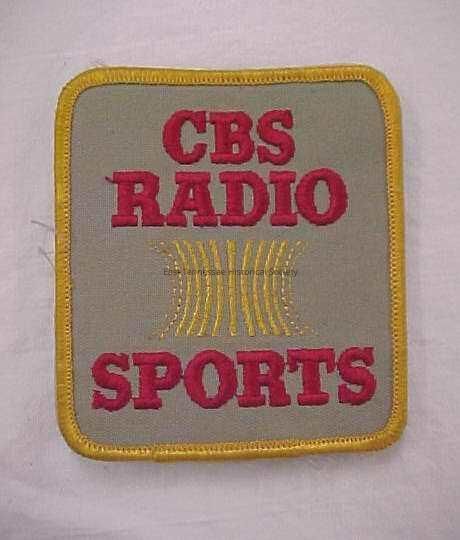 Rectangular gray cloth patch with rounded corners, gray cloth backing with three metal clutch pins, yellow piping around perimeter, red captial lettering: "CBS/ RADIO/ SPORTS" with set of yellow parallel diverging lines between "RADIO" and "SPORTS," 4"l x 3 1/2"w x 1/2"dCollection