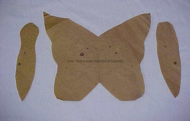 b) oval (1.75in x 6.75in) Oval shape with one pointed end. May have been used as template for body. Cut from brown paper.