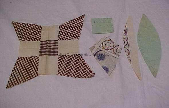 b) Diamond (3.75in x 5.75in) cut from a multicolor page of quilts.