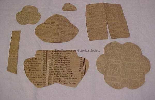 e) Pant shape (9.475in x 5.25in) cut from news paper. Pencil line around edge.
