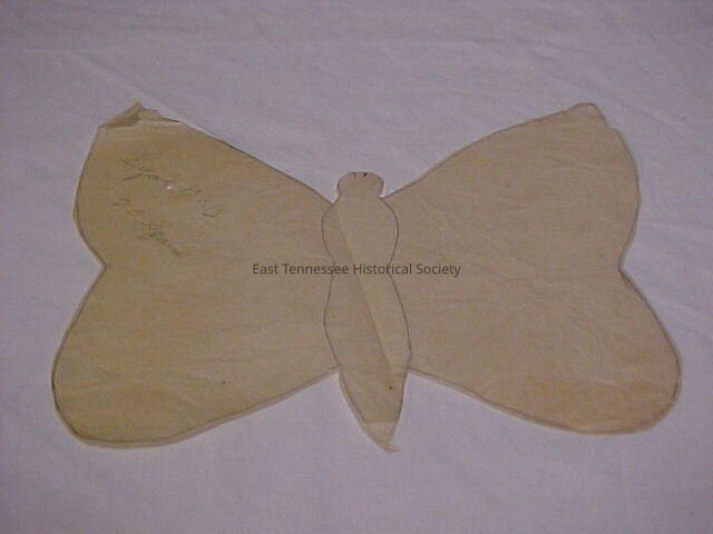 Butterfly quilt pattern. Cut from tissue paper. Wings and body have been outlined in pencil, eyes also drawn in pencil. Left wing marked "Sqair (?)" 13x13/ 20 sqairs"