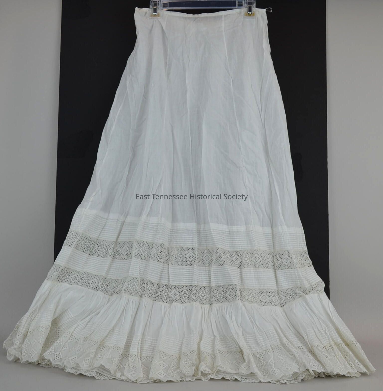Petticoat (appears to be adapted from bottom of summer dress), white linen and lace, seven gores, back center opening, two rows of 1/8" tucks with 2" lace inserts, 2 1/2"w row of tucks at top, 2"w row of tucks at bottom, double flounce attached to bottom insert with 1 1/2" row of tucks and 3 1/2"w scalloped lace edging on top flounce, bottom flounce with 3/4"w row of tucks 1/2"w lace, entire 16"w flounce top stitched to gored section, back shortened 1" at center tapering to 1/4" at sides (original dress was longer at back), 40"h x 52" hem/15" waist, handmade, c. late 19th century.