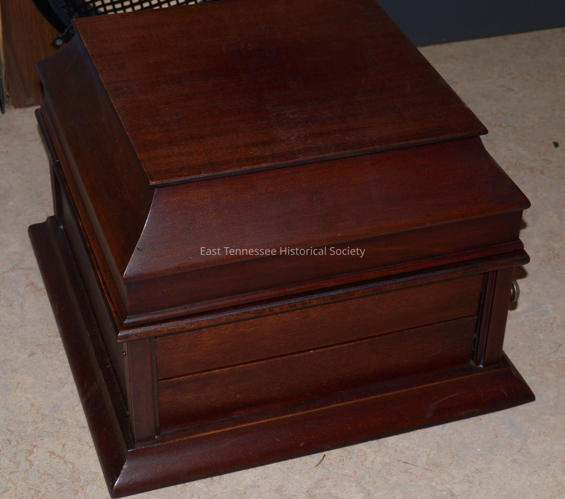 Grafonola tabletop phonograph record player, type C-2, dark-stained oak case, hinged lid, operating hand crank on right side, knob on right side adjusts two front slats to regulate volume, manufacture's decal on inside lid, (replacement) green-felt turntable, three small needle cups with additional needles, speed regulator switch, Columbia (USA), 17"h x 12"w x 17"d, c. 1918.