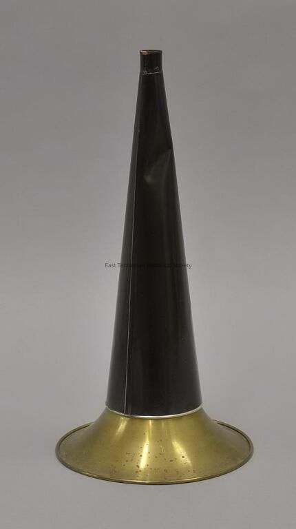 Phonograph horn to amplify sound, metal (partially brass), black tube with brass-colored rim, 14"h x 7" diam., not original / date unknown.