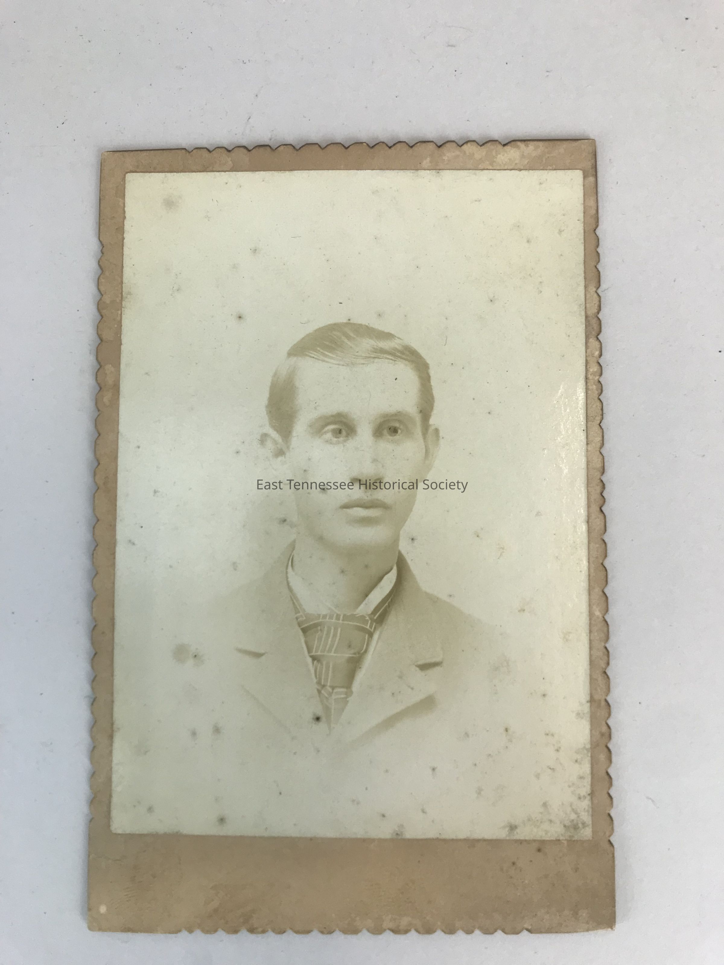 Photograph of young man on fading, light background; he is wearing a suit with tie and has dark fair, thin face; corners of frame straight but center top, center right, bottom center and center left all have decoratively trimmed edges; back has dark brown tape marks at bottom right, top right, center right, top center, and center left.Dimensions