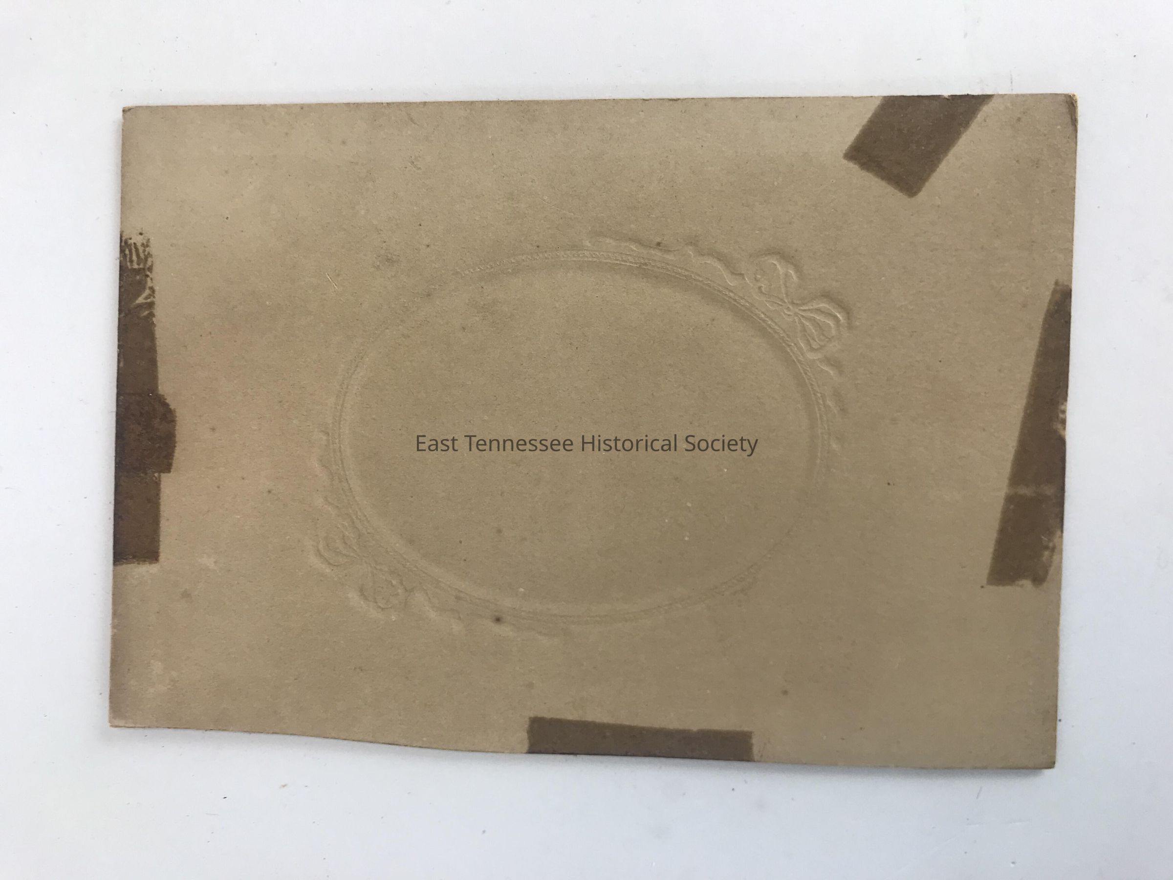 Beige front with beige decorative border with bows surrounding picture at center, photograph of elderly women is front of white background, sepia coloring with black dress and white hair, also wearing glasses; beige back with tape residue stains.Dimensions