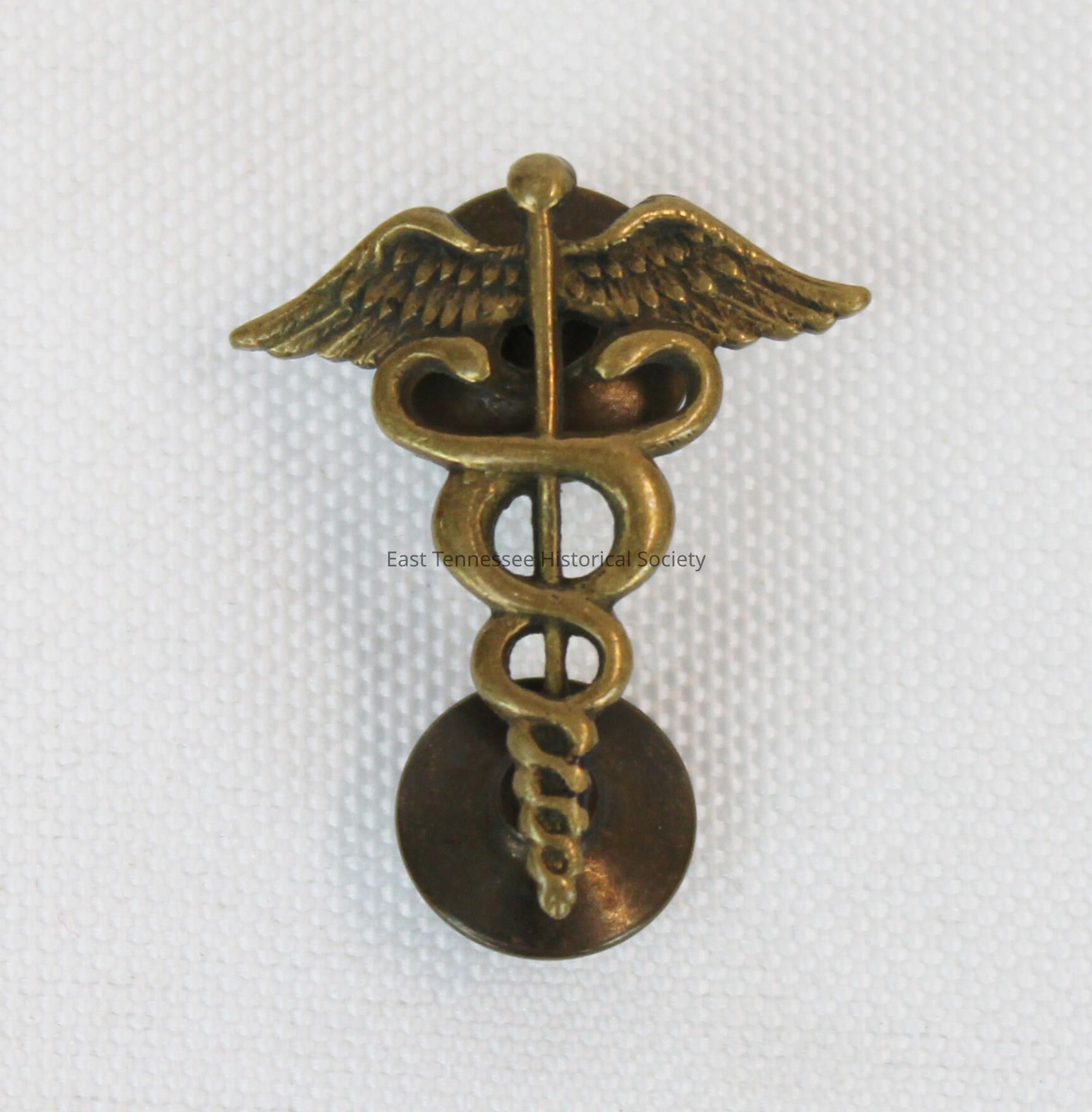 Military insignia/caduceus of Edward W. Ellis for Major U.S. Army, metal (brass?), two serpents entwining staff, slightly curved wings to reverse, two pins with matching push clasps on reverse, without marks, manufacturer unknown, 1 1/32"h x 7/8"w x 3/8"d, c. 1936-1942.Made/Created