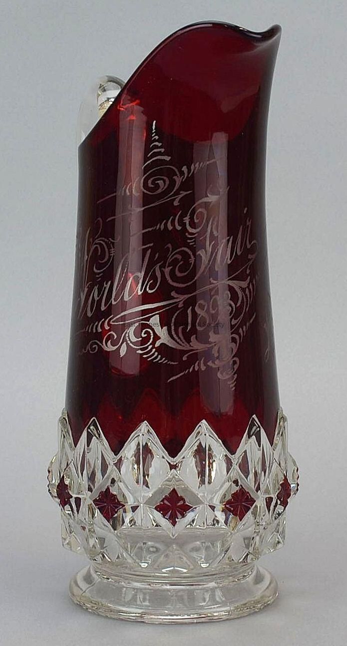 Pitcher (part of set with six goblets), pressed glass in Red Block pattern, ruby-stained tapered top with graceful spout, clear bottom with raised squares and diamonds, red rosettes at center squares, "World's Fair 1893" etched in script on one side of red section and "Lydia Seilaz" on the other, clear-glass applied handle, manufacturer unknown, 11 1/2"h x 7 1/4"w x ?d, 1893.Made/Created
