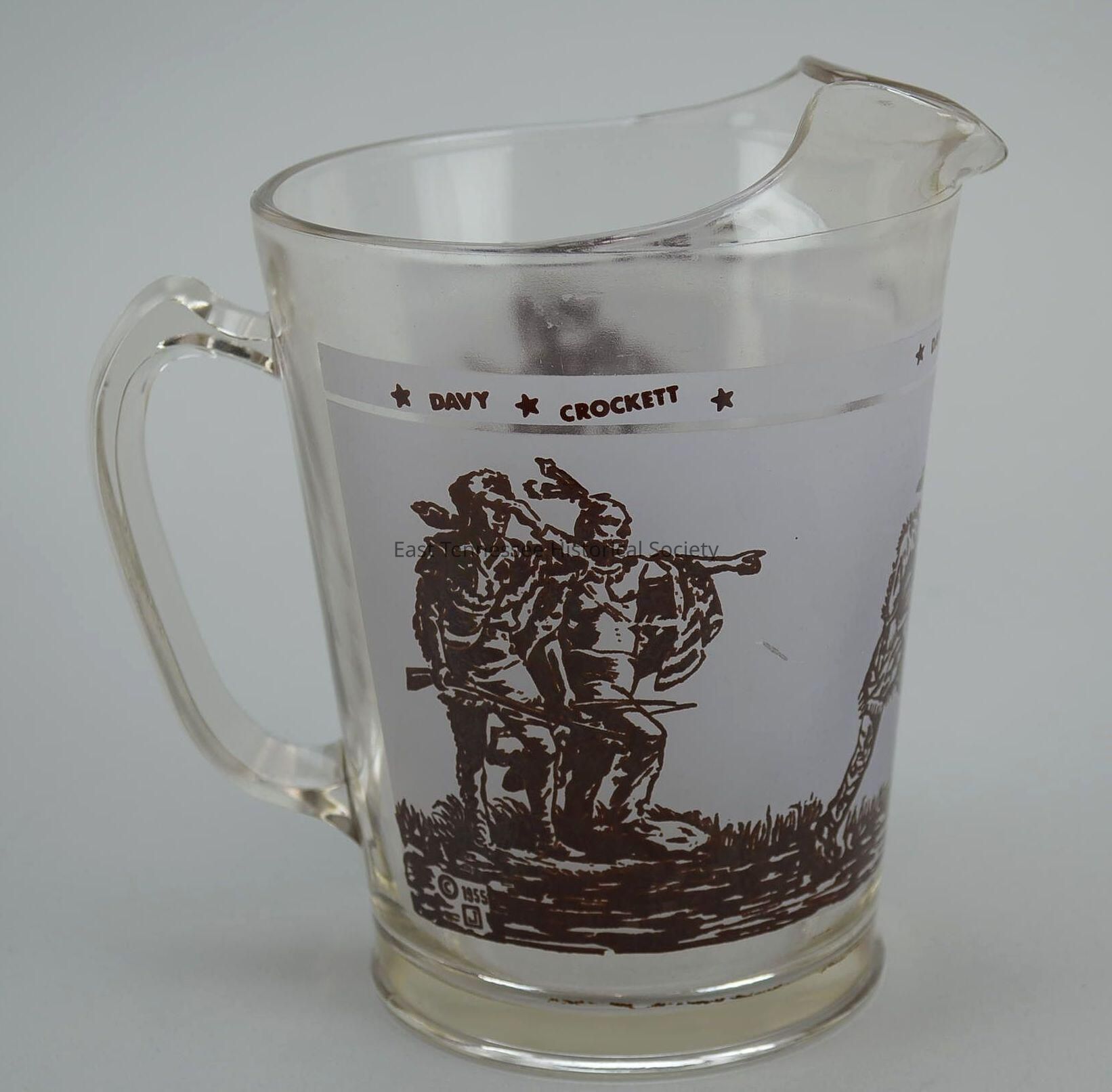 Pitcher with three scenes of Davy Crockett in action--gazing into distance with an Native American, fighting a bear, and on horseback, clear glass with black decoration on grayish-white backgroud, covers 3/4 surface, marked with copright 1955.Made/Created