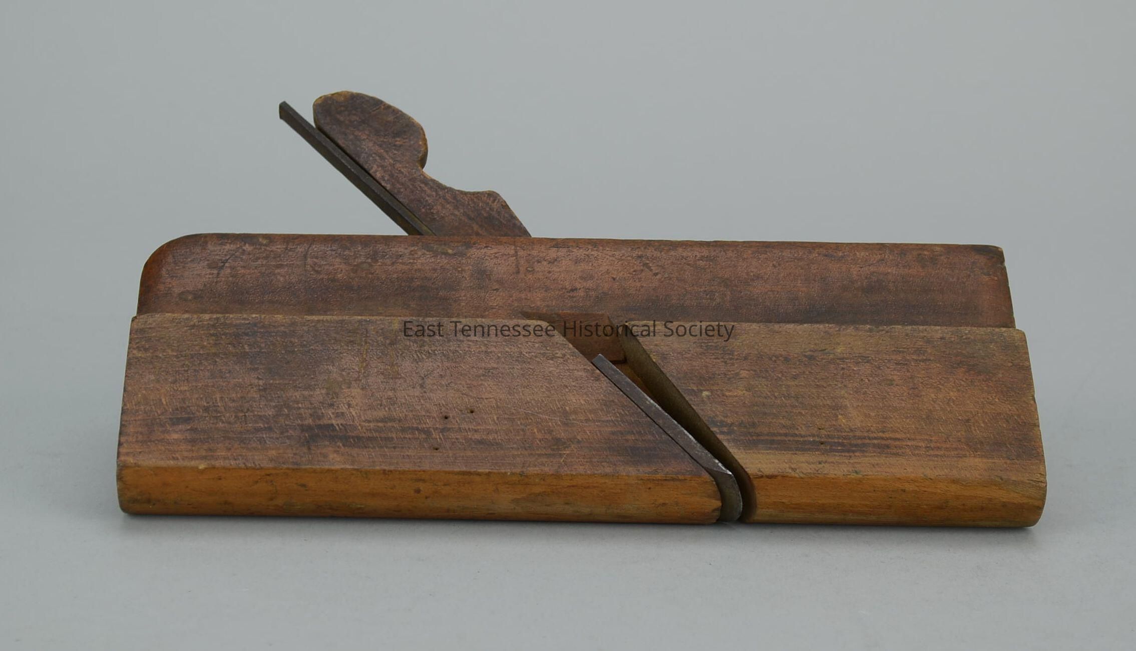 Plane (cuts a groove, 1/4"w groove), beech wood, wood rectangle with square front and rounded back, cutting blade with rounded end, stamped front marked "Mfgr. J.H. Wheeler 72," back stamped "MAH 5" horizontally "W.H. Wheeler" diagonally, Scioto Works (NY, brand name used by Ohio Tool Co., 1893-1907), 5 3/4"h x 9 1/2"w x 1 1/4"d, 1893-1907. Bolt added where wood split.