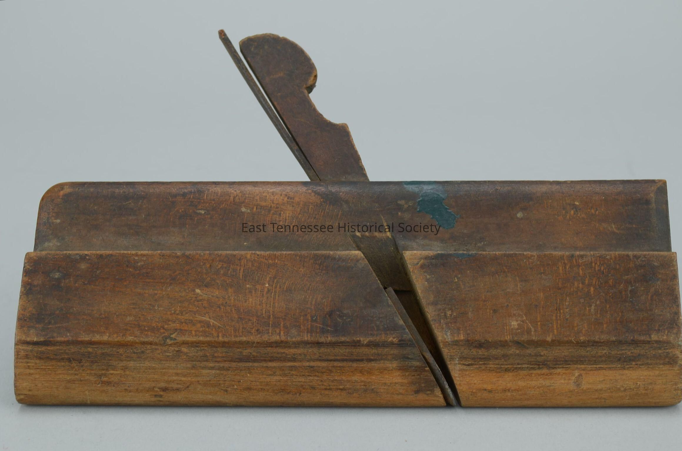 Groove plane #764, wood rectangle, 9/16" diagonal cut top to bottom to hold blade and blade holder, special kind of 5/8" curved blade, marked "Greenfield Tool Co Greenfield Mass" in curved letter at front, marked "No. 764" at back, 9/16"w paper label remnant at hand hold, manufactured by Greenfield Tool Co. (Greenfield, Mass), 6 1/4"h x 9 1/2"w x 1"d, 1851-1883.