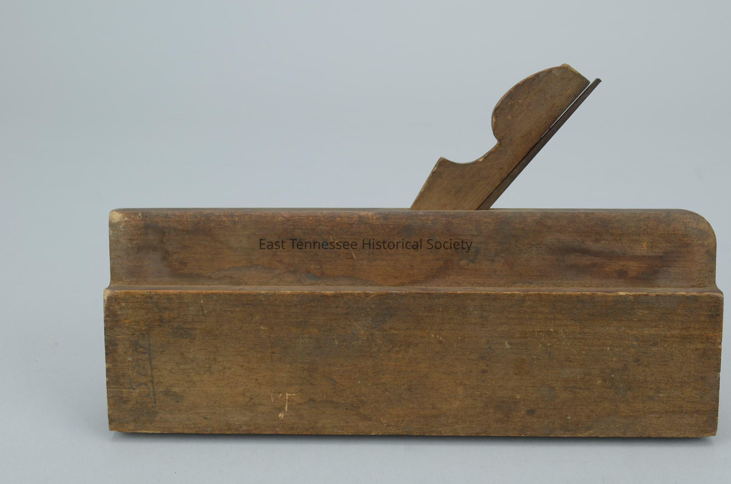 Groove plane of set (cuts groove for tongue), wood rectangle, diagonal slot top to bottom to hold metal blade and wood blade holder, front marked "Ohio Tool Co," back marked "76" and "3/8," set back at top with rounded edges, finger holds at front and back, two metal plates screwed on side at blade, dado and blade at top rests against back of opening, metal strip protects bottom edge, 3/8" size, Ohio Tool Co.
