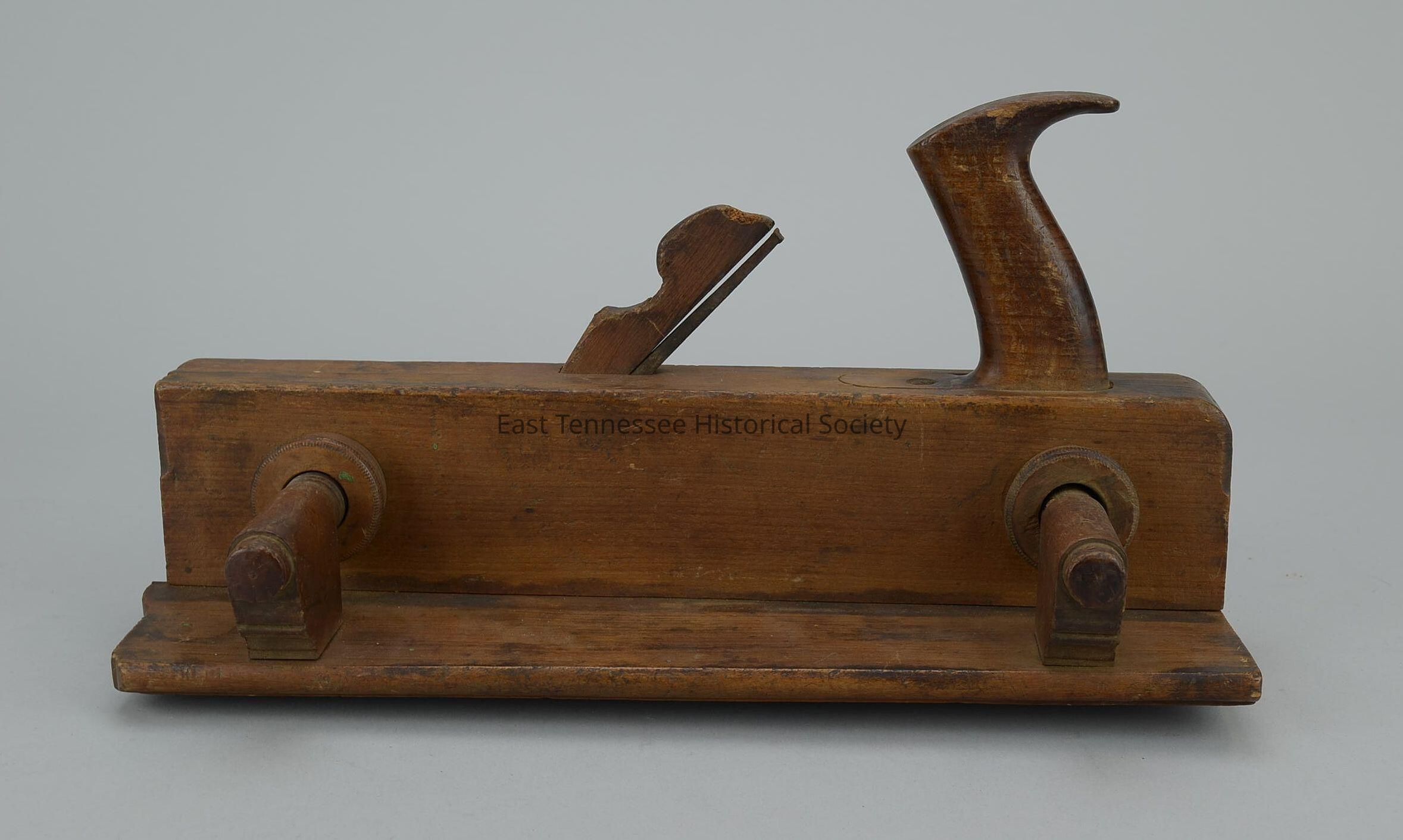 Groove plane (one of tongue-and-groove set), wood with two metal guides on bottom to cut groove, blade removable from one, shaped wood handle, two turned wood knobs on right side front and back attached by screw that goes through plane to holder on opposite side, plane motif with Ohio Tool Co. on front, "34" on back, manufactured by Ohio Tool Co. (USA), 7 1/2"h x 7"w x 14 1/2"d, 1851-1913. (Company closed in 1913.)Made/Created