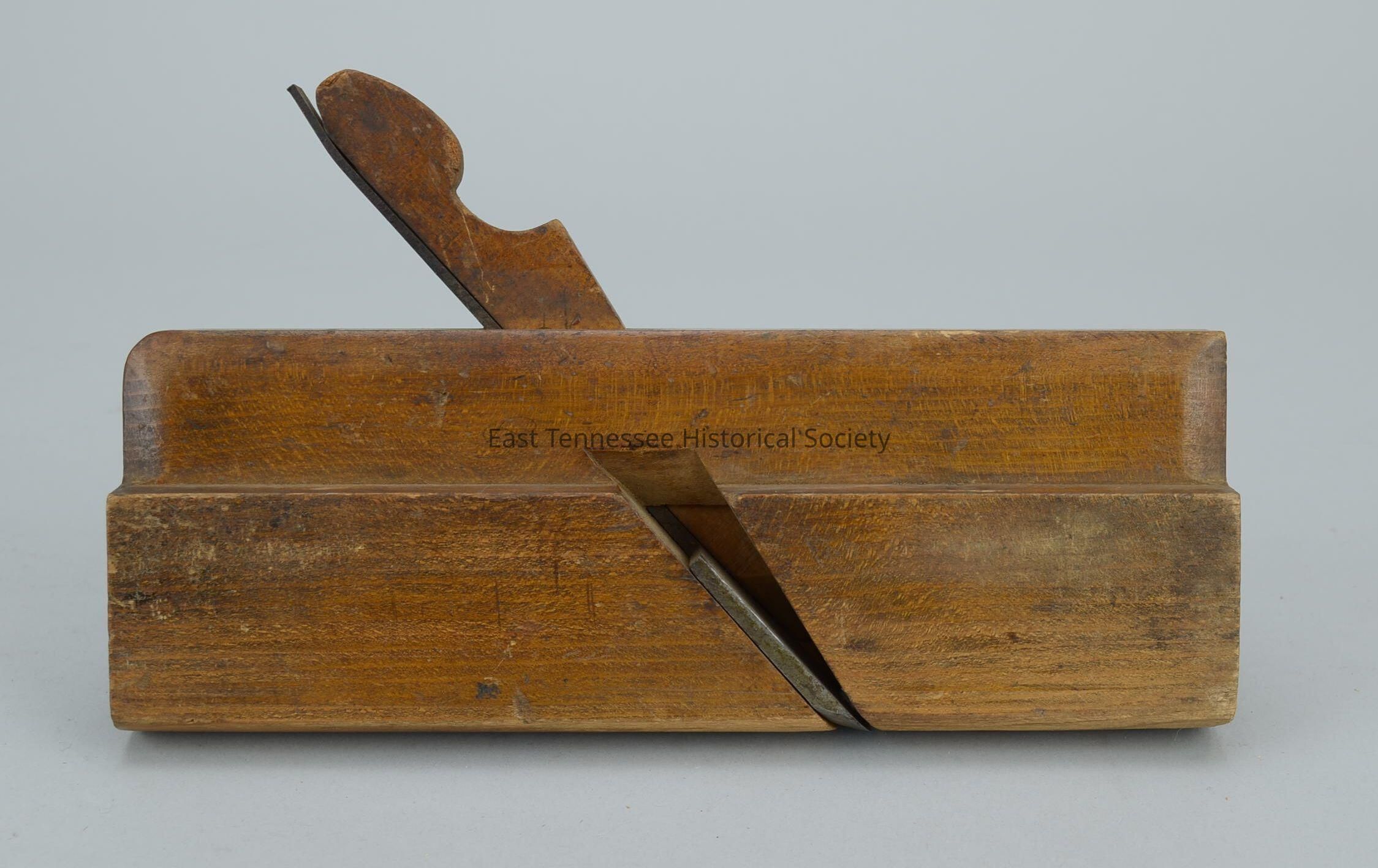 Molding plane (makes grooves but not from tongue-and-groove set), wood rectangle, No. 8 (radius), diagonal cut top to bottom for blade and holder, 1 1/4"w blade with rounded end set back 1/2", marked "J.H. Wheeler" [previous owner] at back end, marked "OHIO TOOL CO Columbus" at front in arched lettering, "Thos. Holliday & Co. Cin. O."[seller], rounded on bottom,THOS. HOLLIDAY & CO. / CIN. O." [company that sold it] in two lines of arching lettering, JH WHEELER [previous owner of the plane], manufactured by Ohio Tool Co. (Columbus, OH) with sunburst logo, 6"h x 9 1/2"w x 1 5/8"d, 1851-1913.