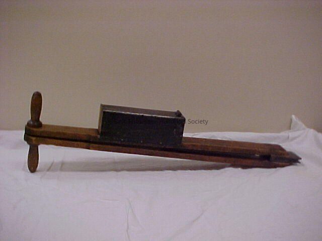 Corn planter. Made from two long pieces of wood. At top of wood are two spool like handles. At bottom of wood are fixed two jointed metal scoops. One side is a small metal box with a wooden bottom and top. This box would have been used to hold seed. When handles of wood are together a small tongue of metal is inserted into the box, collecting a seed. When the handles are pulled apart the tongue pulls the seed out of the box and drops it into a metal chute to be planted. Box side of planter marked "H.B.S." Opposite side of box is also marked but is difficult to read: "--TBH-MPH?" "MANUFD (/) BY/ A.C. KENT/ JANESVILLE/WIS."Collection