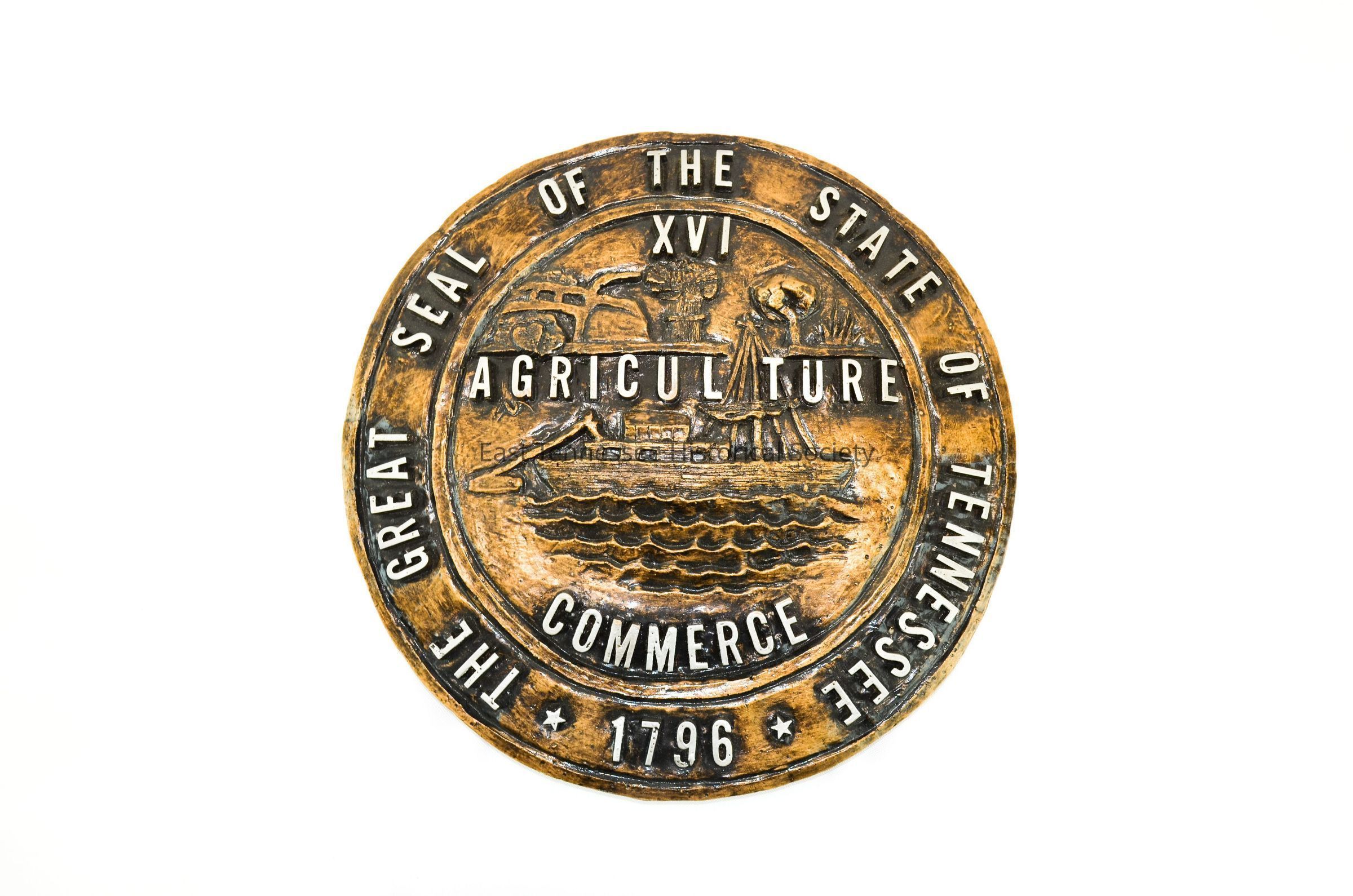Plaque of State of Tennessee seal, copper-painted cement (?) with darker shading and metal letters, hanger on reverse, 12" diam., 1970-1974.