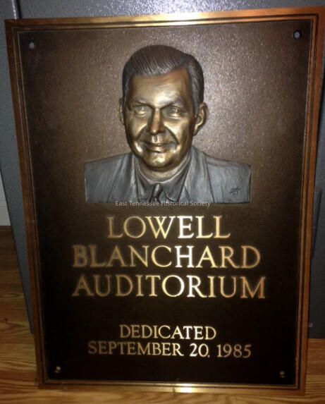Plaque, metal, marked "LOWELL / BLANCHARD / AUDITORIUM / DEDICATED / SEPTEMBER 20, 1985" with bust portrait of Lowell Blanchard embossed above, 24"h x 18"w, 1985.