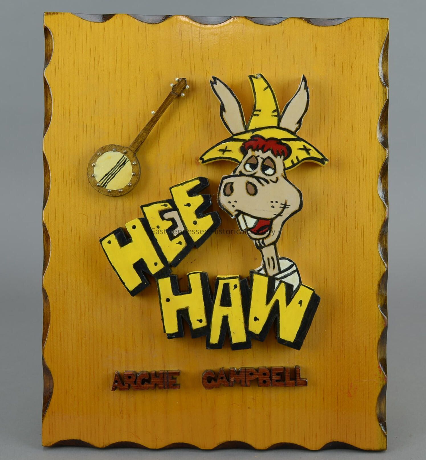 Plaque with three-dimensional lettering and design elements attached, wood, 3-D angeled "HEE" and "HAW" at center with buck-toothed red-haired mule in yellow straw hat (logo for TV program) above "W," 3-D banjo with metal and faux pearl accents above "HE," smaller 3-D "ARCHIE CAMPBELL" at bottom center, scalloped front edge, lacquered elements and natural wood front/dark-stained sides, hanging bracket on reverse, 13 7/8"h x 11 1/4"w x 3/4"d, date unknown/c. 1970s.Collection