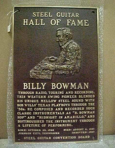 Bronze plaque from the Steel Guitar Hall of Fame, marked "STEEL GUITAR/ HALL OF FAME/ BILLY BOWMAN/ THROUGH RADIO, TOURING, AND RECORDING/ THIS WESTERN SWING PIONEER BLENDED/ HIS UNIQUE MELLOW STEEL SOUND WITH/ BOB WILLS' TEXAS PLAYBOYS THROUGH THE/ '50S. HE COMPOSED AND RECORDED SUCH/ CLASSIC INSTRUMENTALS AS "B. BOWMAN/ HOP" AND "MIDNIGHT IN AMARILLO," AND/ DISTINGUISHED THE INSTRUMENT THROUGH/ A LIFETIME OF PERFORMING./ BORN: OCT. 30, 1928 JOHNSON CITY, TENNESSEE DIED: AUGUST 6, 1989/ INDUCTED: 1989/ STEEL GUITAR CONVENTION BOARD."Collection