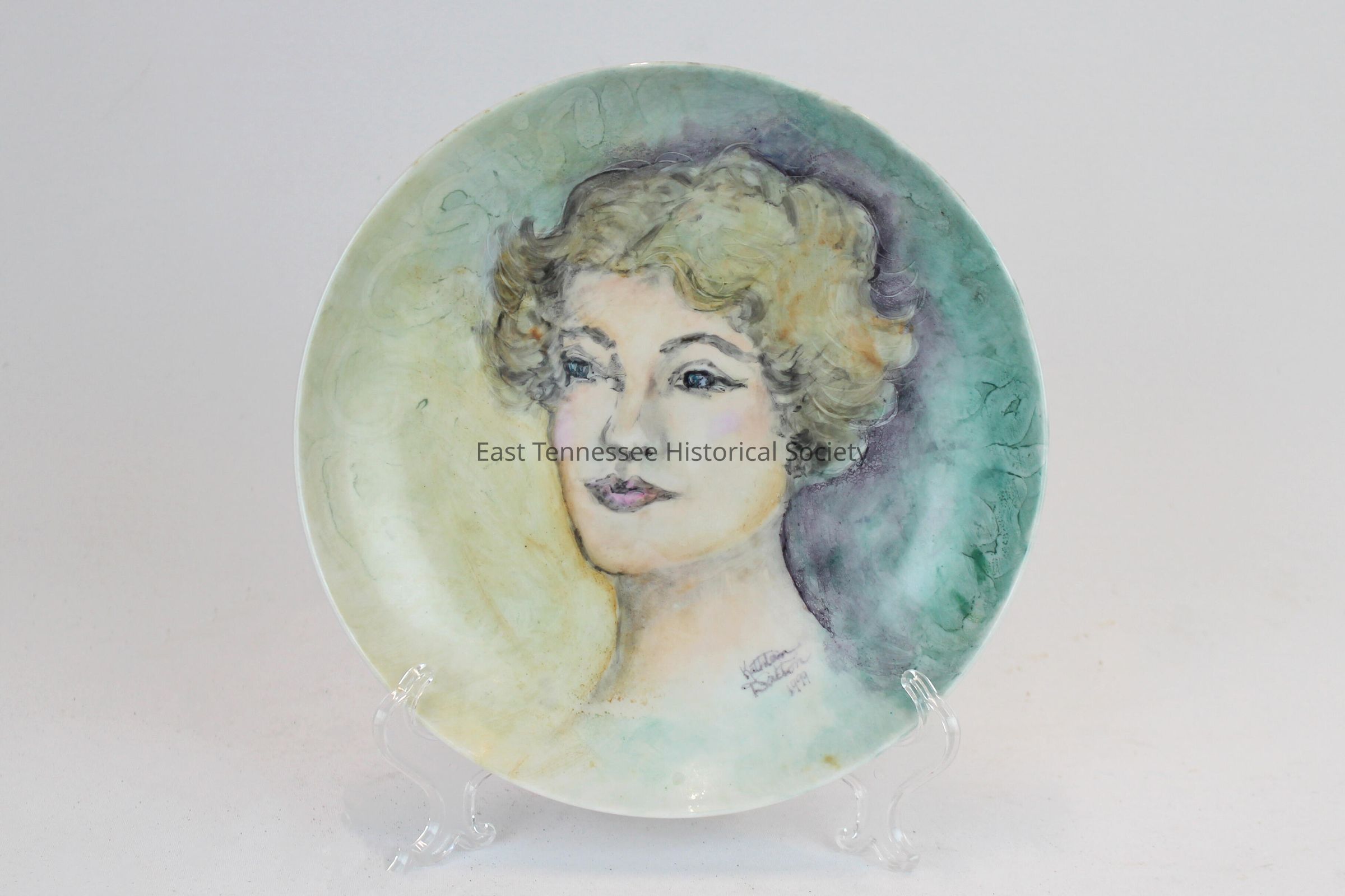 A ceramic plate with a self-portrait of Kathleen Dalton; green and light brown shading around the woman. The woman has blonde/brown hair, blue eyes, and pink lips; "Kathleen Dalton 1999" is written on the woman's neck.Dimensions