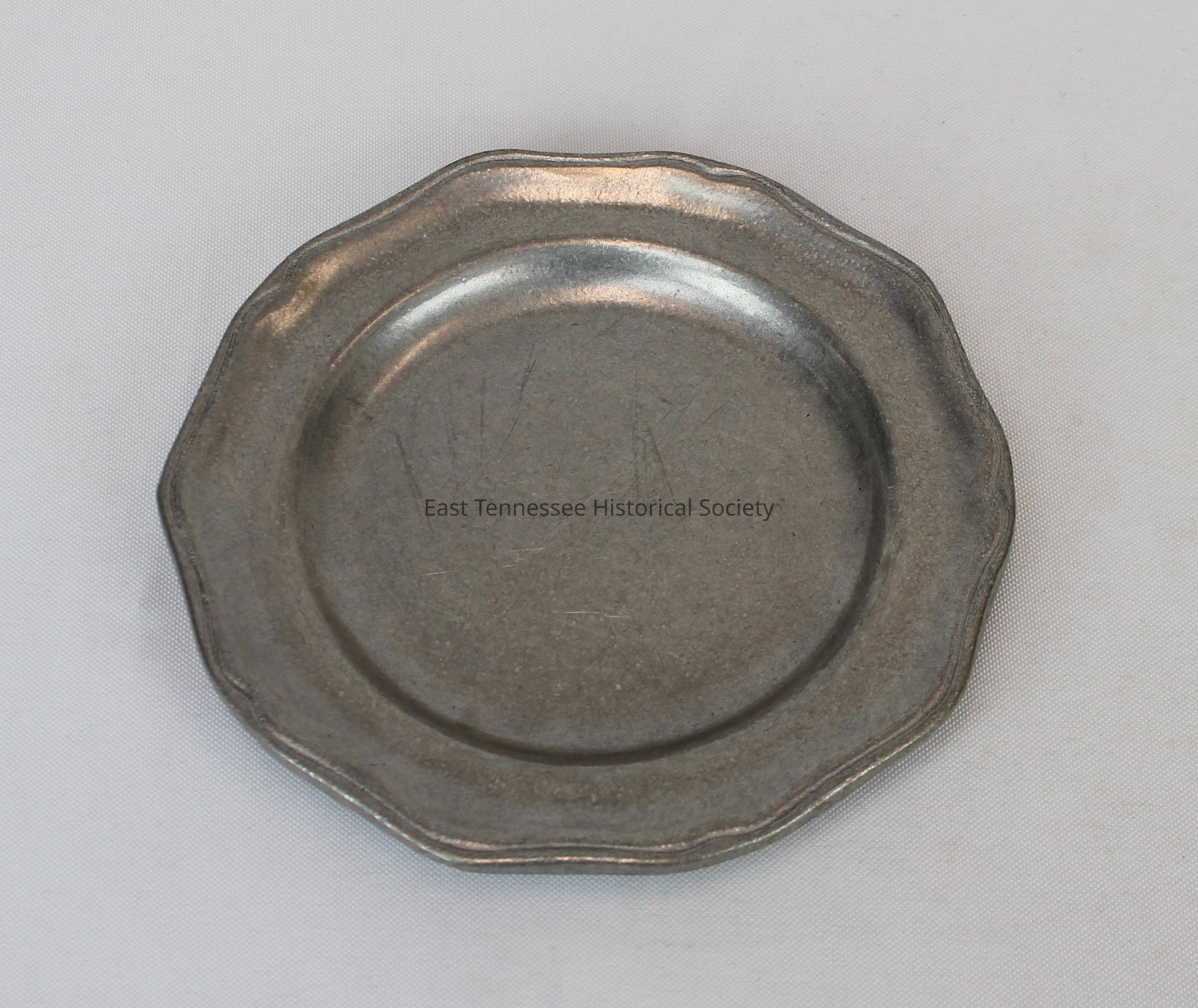 Bread plate with scalloped rim used at Regas Restaurant, round, metal (aluminum alloy, faux-pewter), Wilton (Mount Joy, Penn.), 1"h x 6" diam., perhaps 1980s?Collection