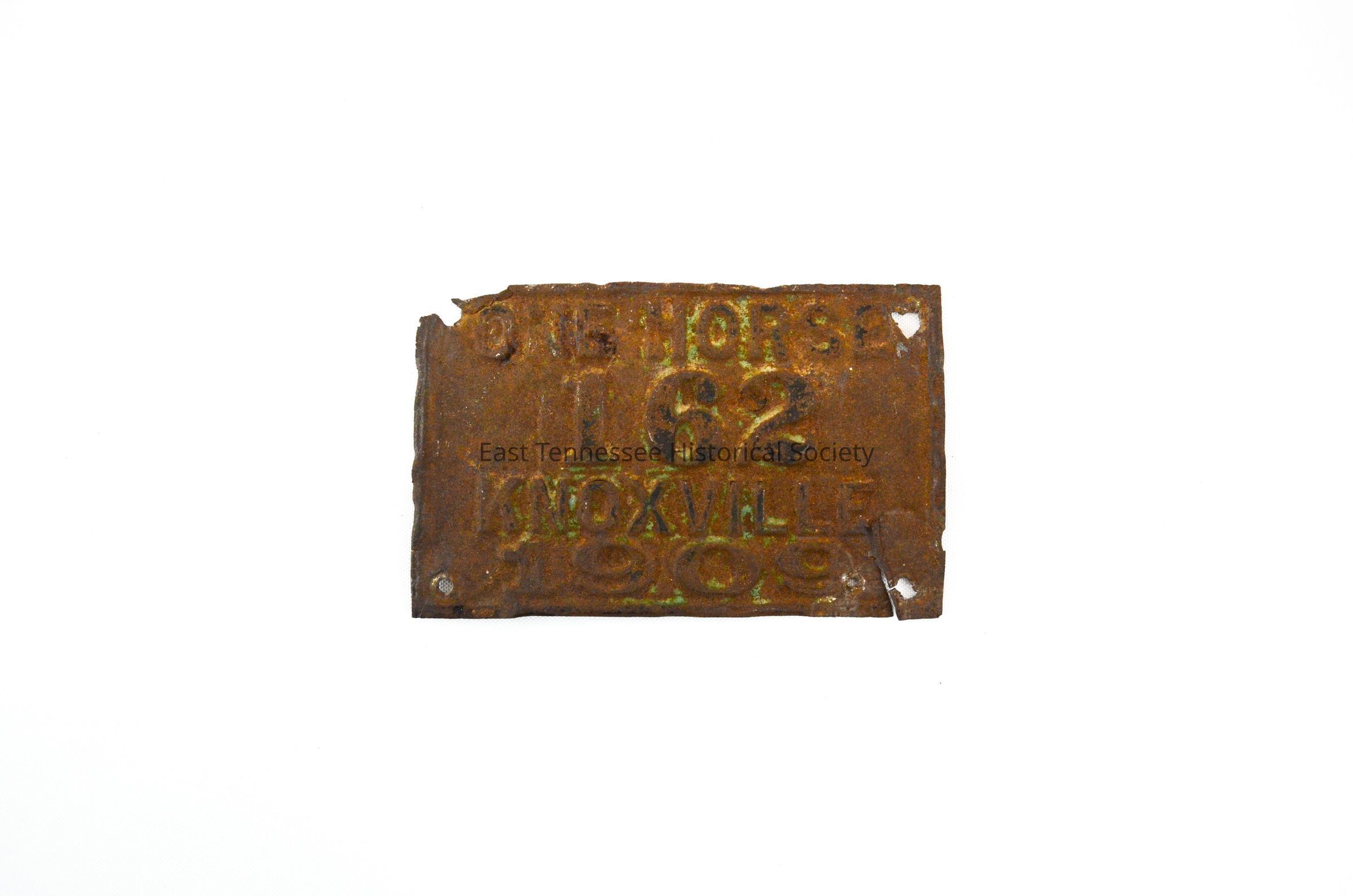 Buggy license plate, metal, embossed "ONE HORSE/ 162/ KNOXVILLE/ 1909," hanging hole at each corner, 3 1/2"h x 5 1/2"w, 1909.