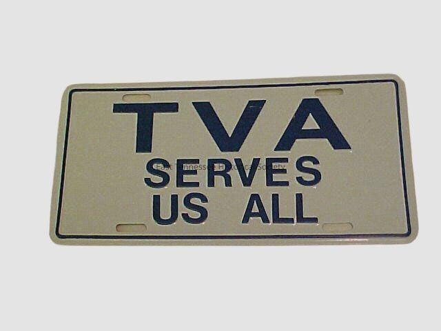 License plate marked "TVA SERVES US ALL," blue lettering on white background.