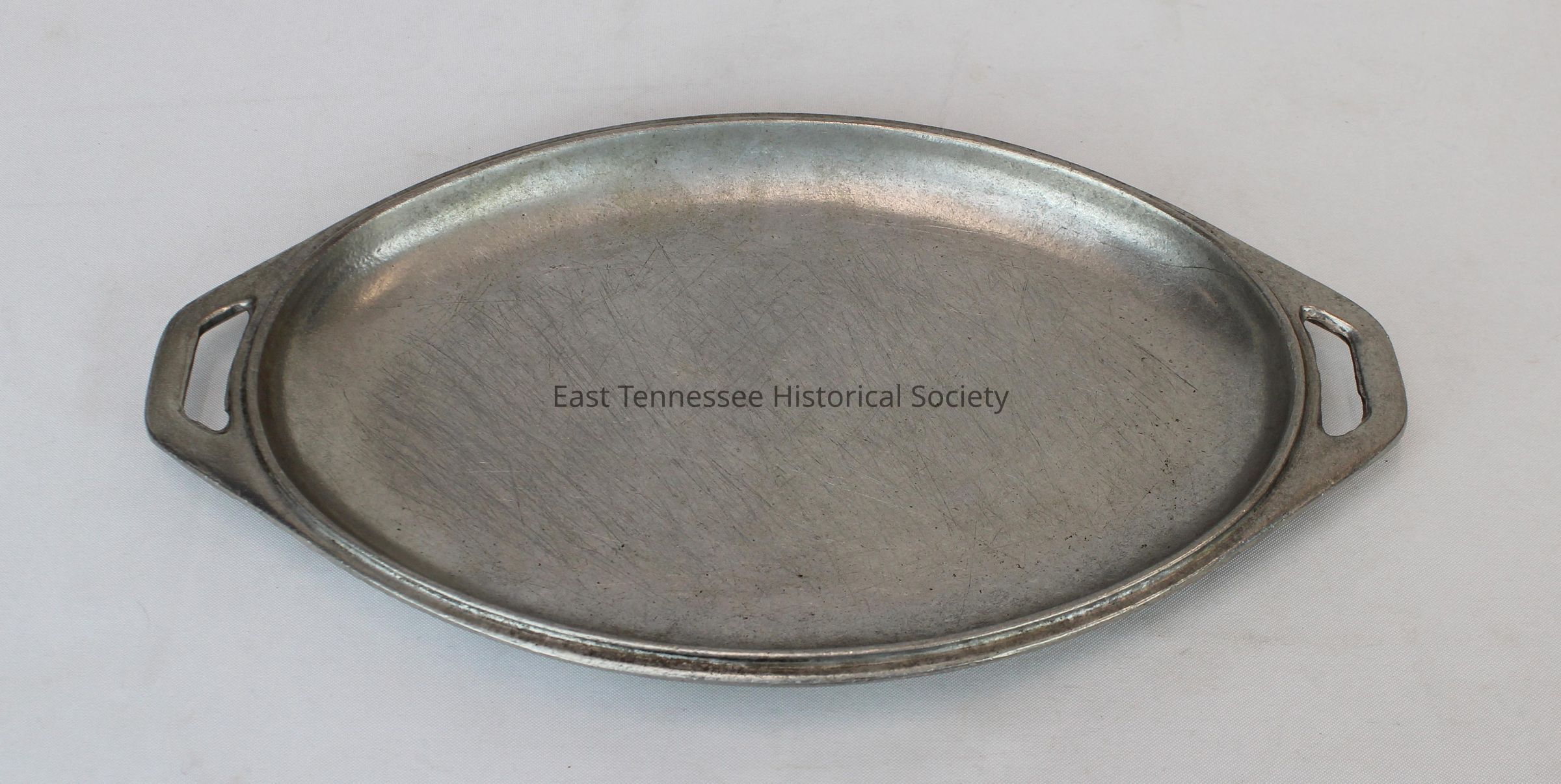 Platter with open handle at each end used at Regas Restaurant, metal (aluminum alloy, faux-pewter), oval, plain design with raised rim, 1"h 15 1/4"w x 9"d, unknown manufacturer.Collection