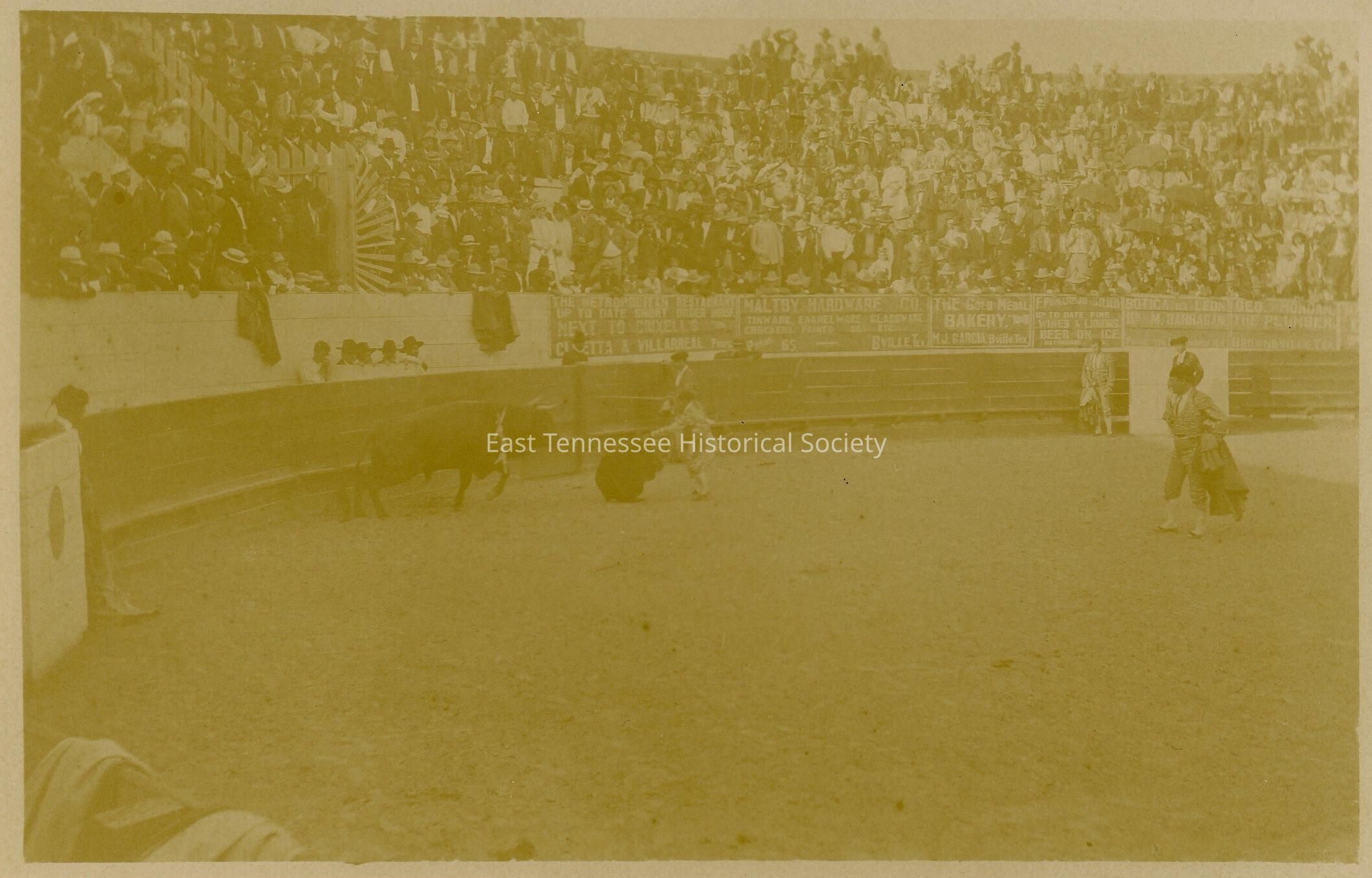 Black-and-white photo postcard of bull fight, Brownsville, Texas, 3 1/2"h x 5 1/2"w.