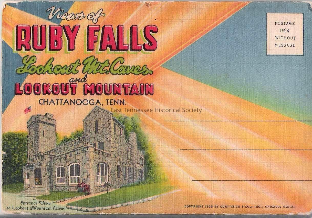 Postcard folder, "Views of Ruby Falls, Lookout Mt. Caves and Lookout Mountain, Chattanooga, Tenn." with foldout of 18 images in color, copyright 1938 by Curt Teich & Co., Chicago, U.S.A. 4-1/4"h x 6-1/4"w.Made/Created